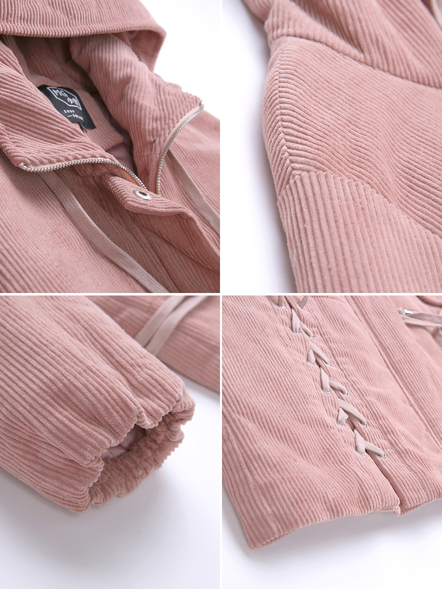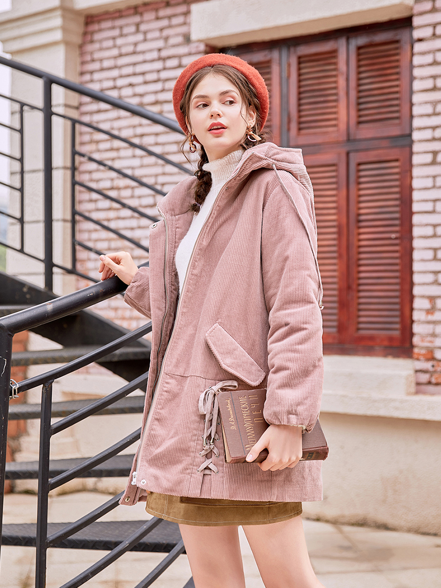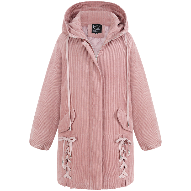 MG小象燈芯絨棉服女中長款寬松2018冬季新款學生連帽休閑棉衣外套