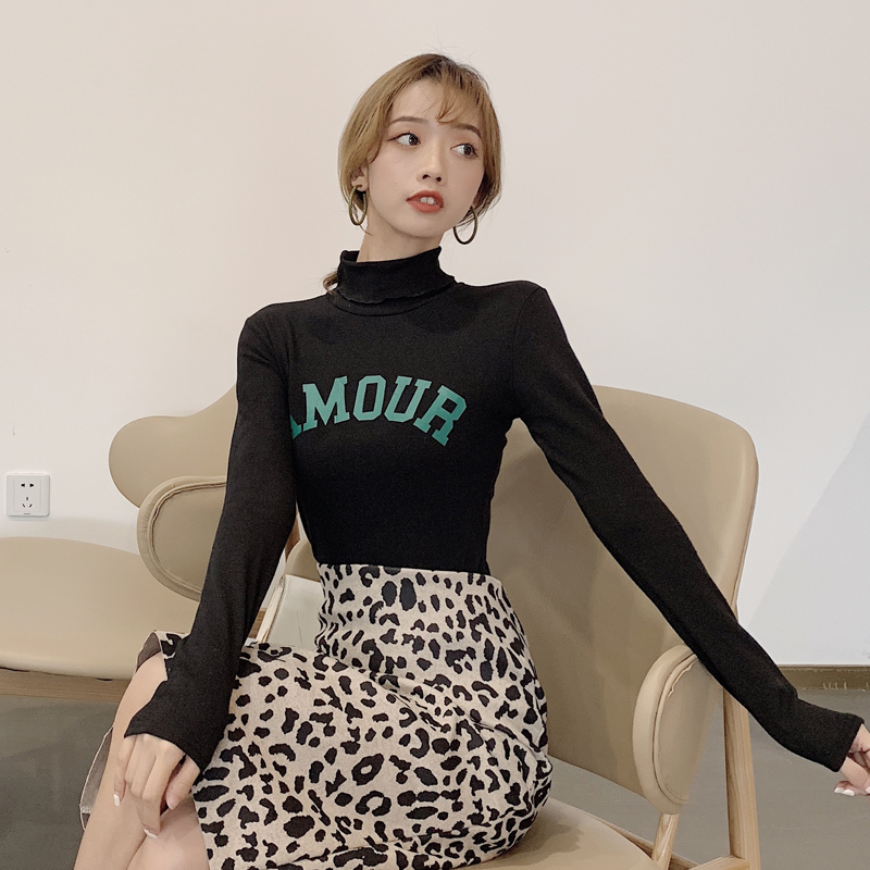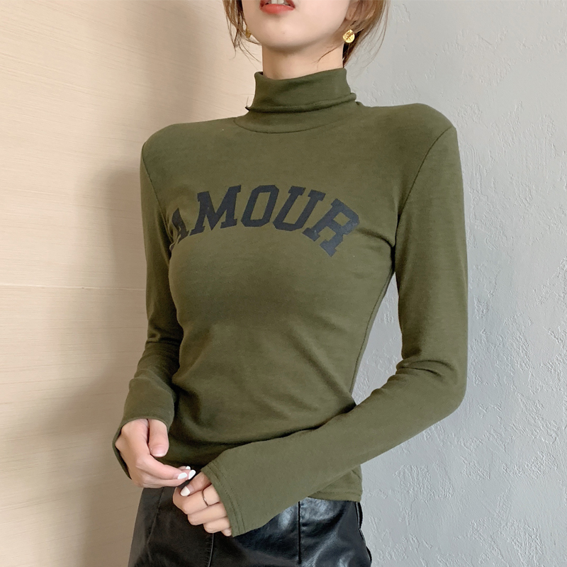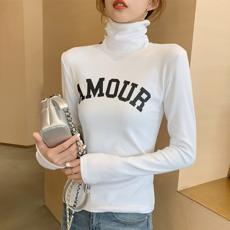 港味秋冬高領長袖字母印花T恤女顯瘦修身上衣磨毛加厚高領打底衫