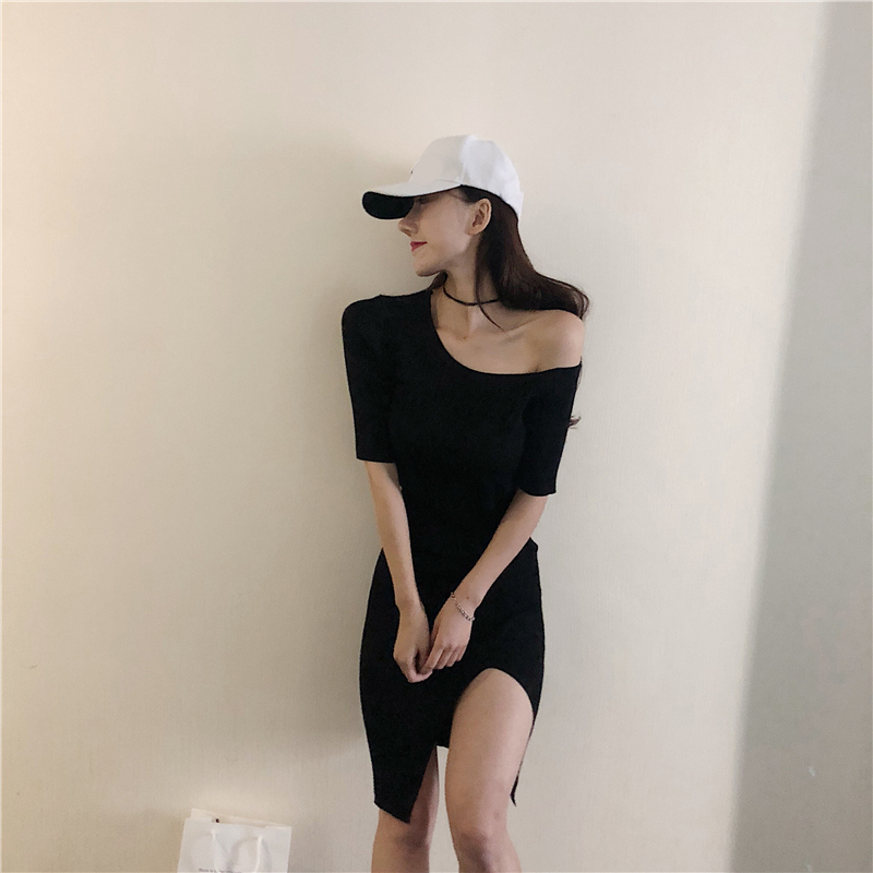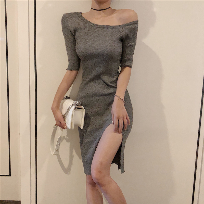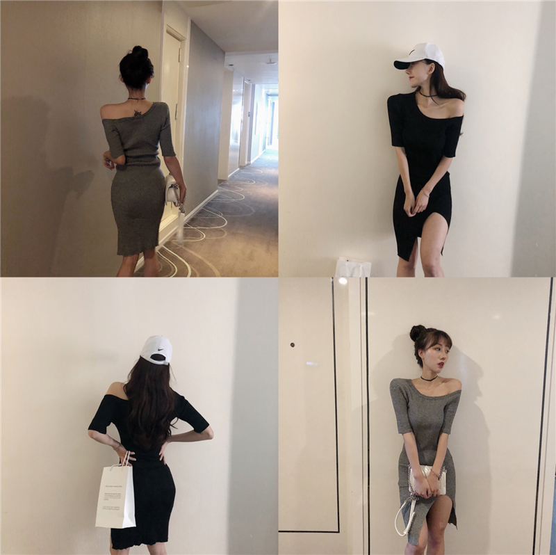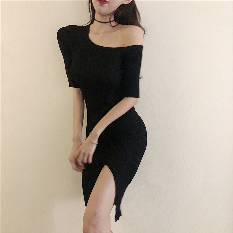 / 小心機設計感新款百搭秋季針織性感斜肩中袖連衣裙修身包臀夜店裙