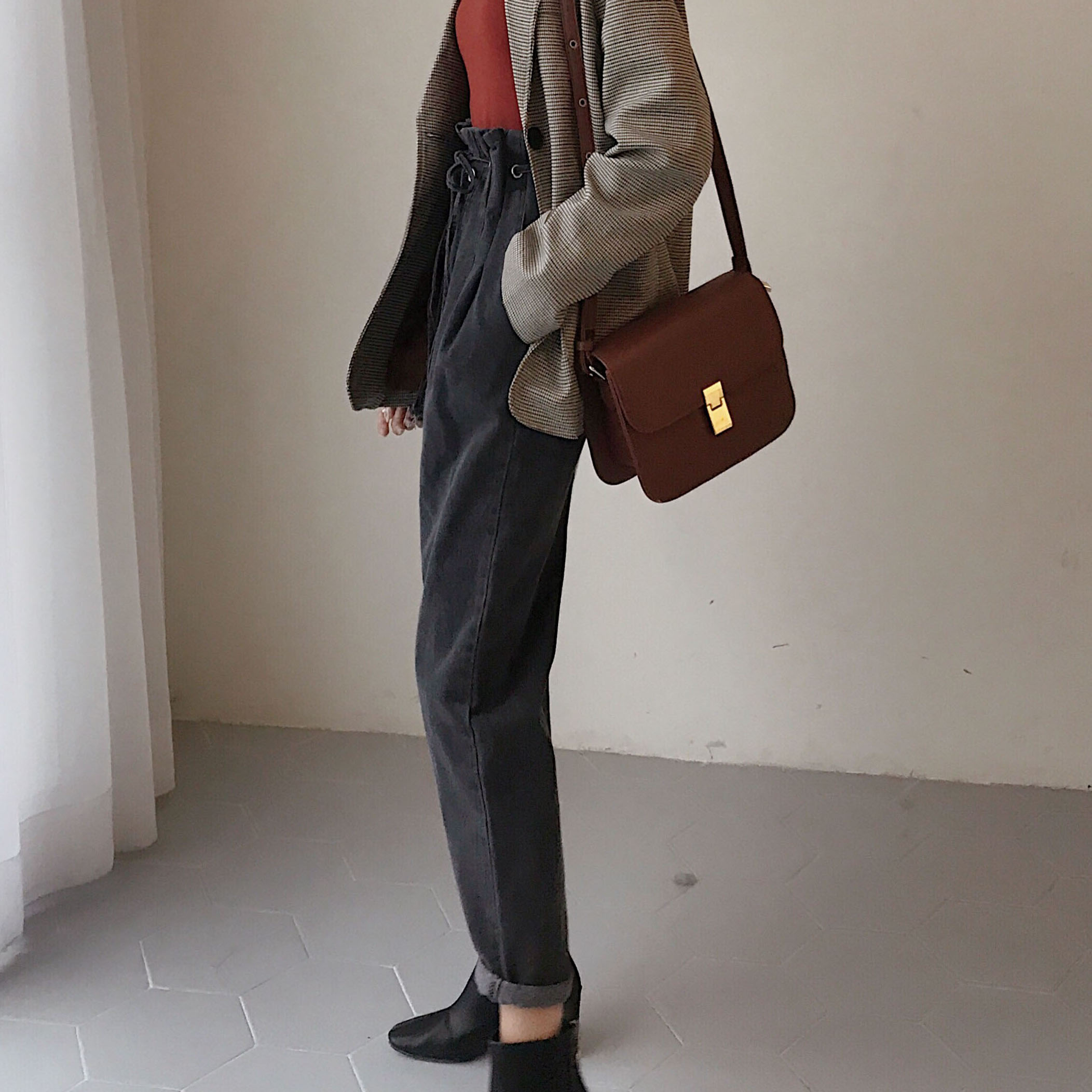 / 港味復古高腰系繩牛仔褲女秋冬2018新款寬松顯瘦百搭老爹褲蘿卜褲