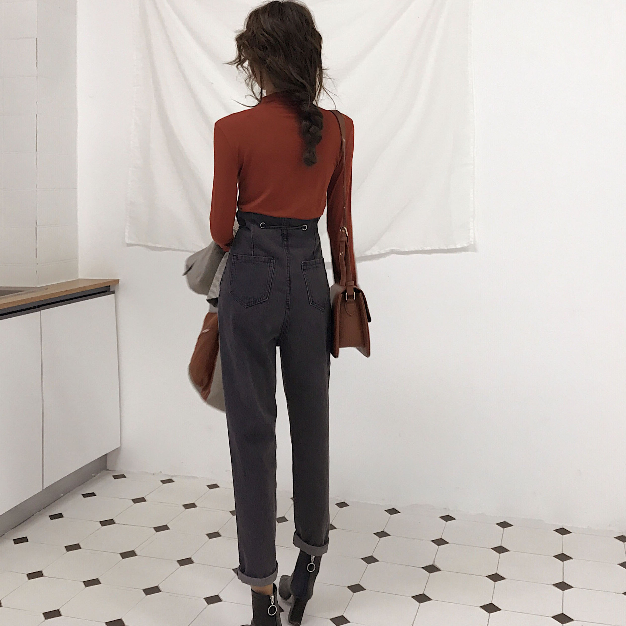 港味復古高腰系繩牛仔褲女秋冬2018新款寬松顯瘦百搭老爹褲蘿卜褲