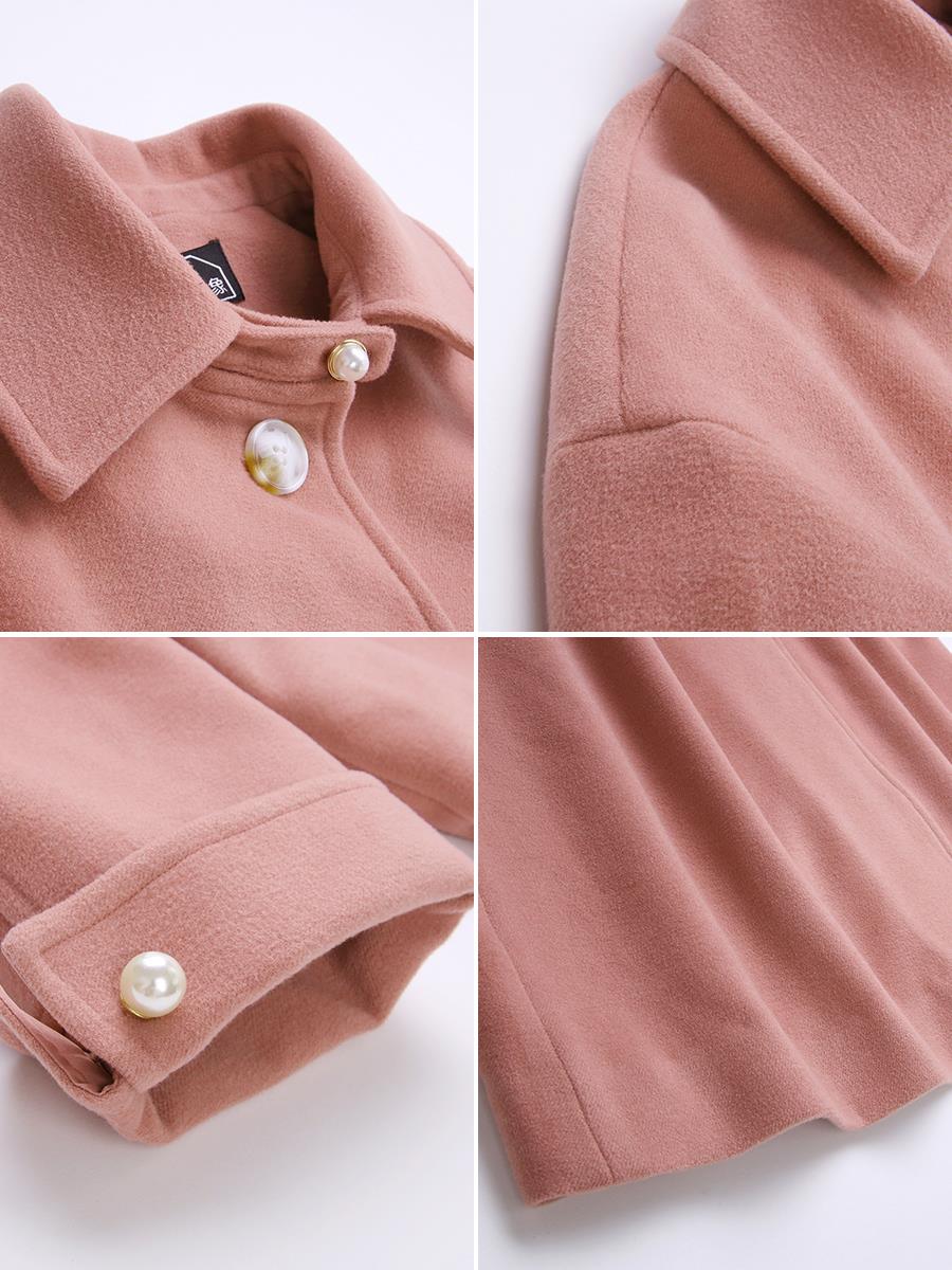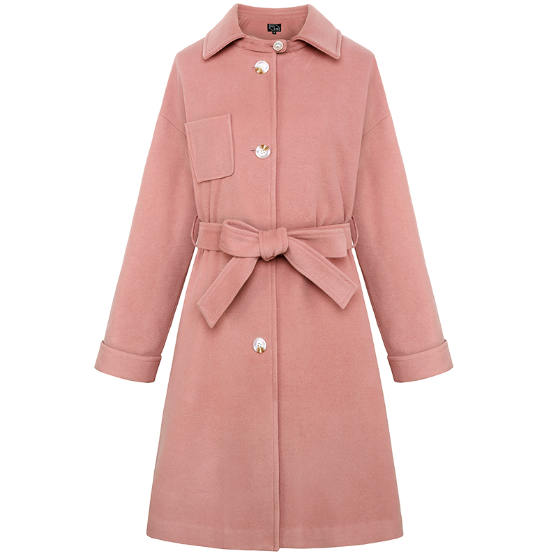MG小象秋冬毛呢外套女中長款寬松2018新款蝴蝶結收腰粉色呢子大衣