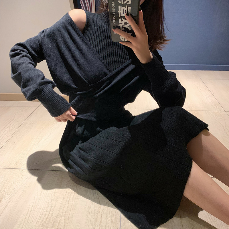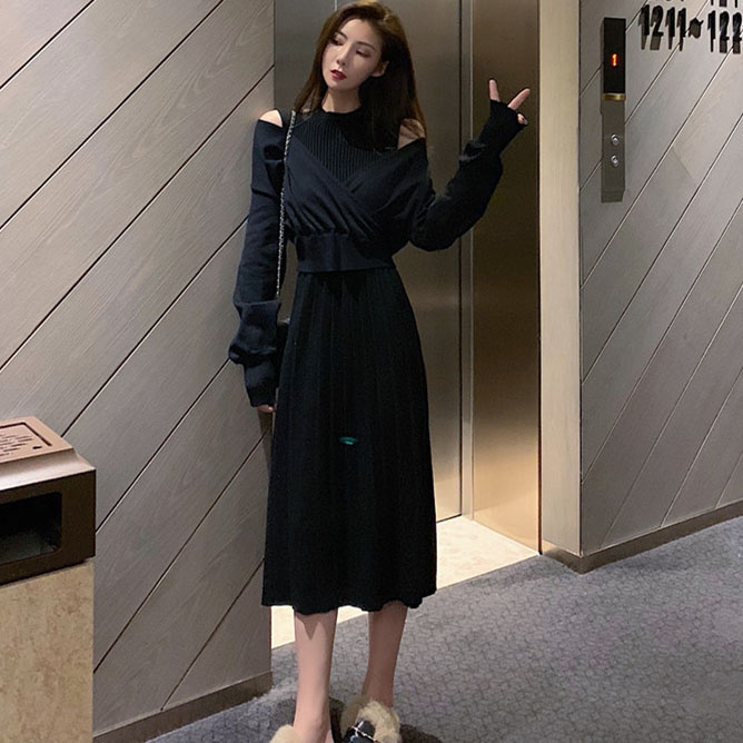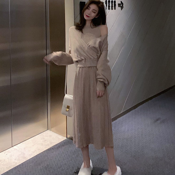 復古韓國chic風V領蝙蝠袖短款毛衣女2018新款+百褶針織背心連衣裙