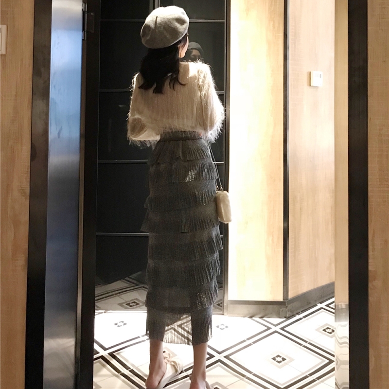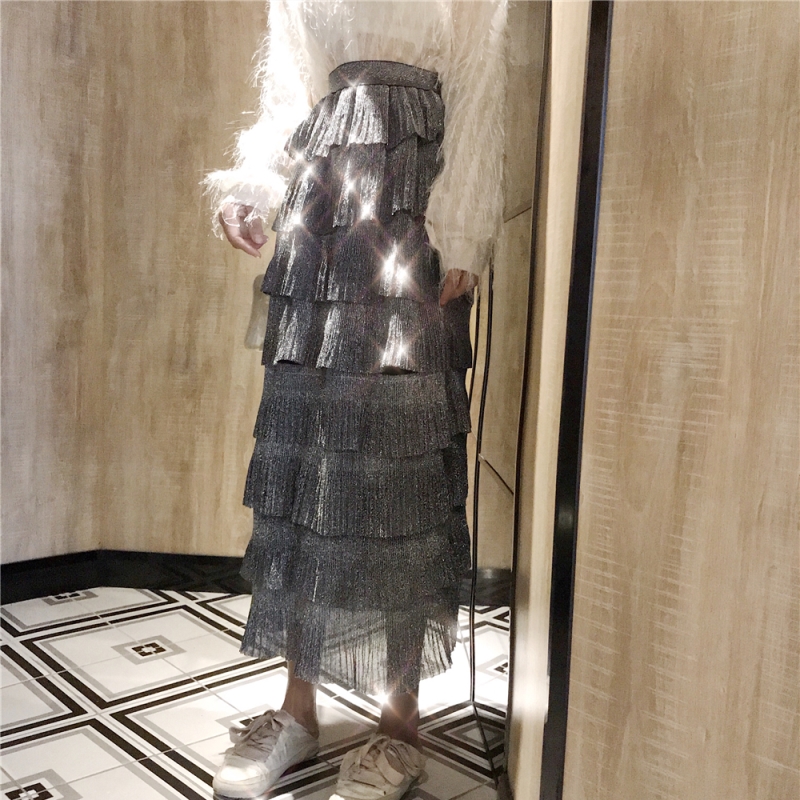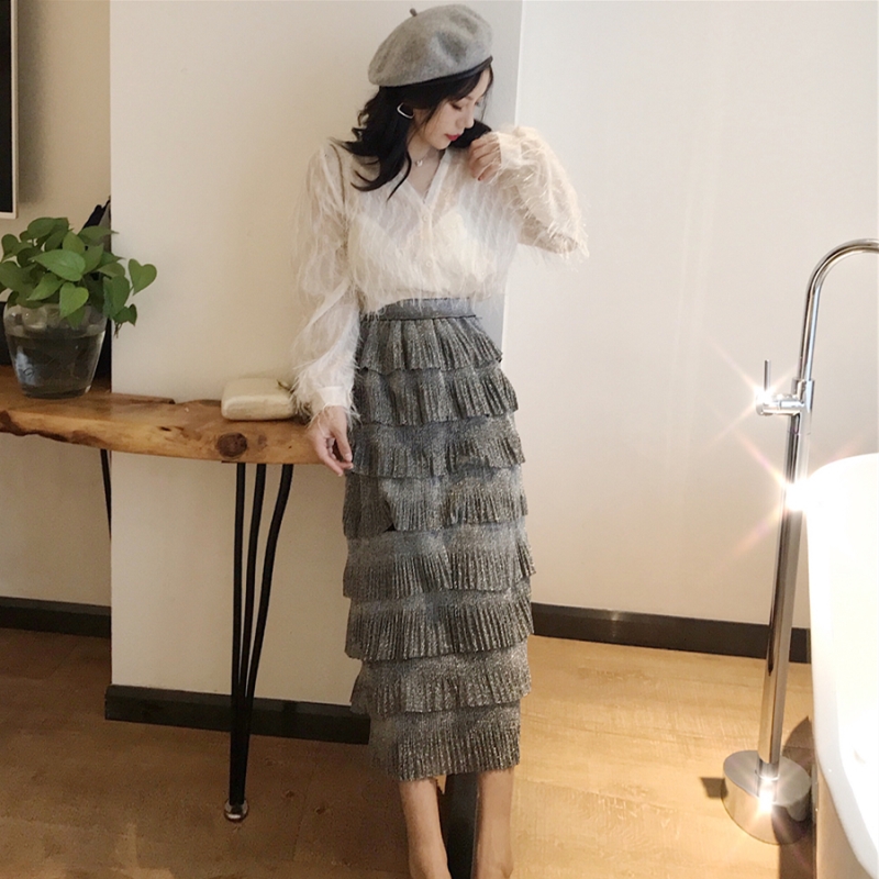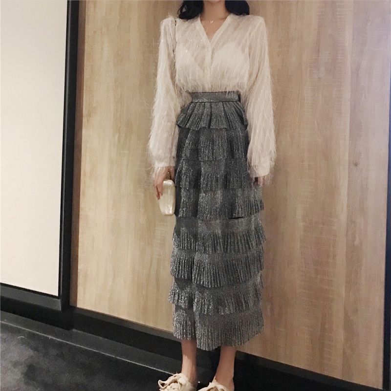 / 2018秋裝港味亮絲V領襯衫上衣女+高腰時尚氣質閃閃亮絲蛋糕半身裙