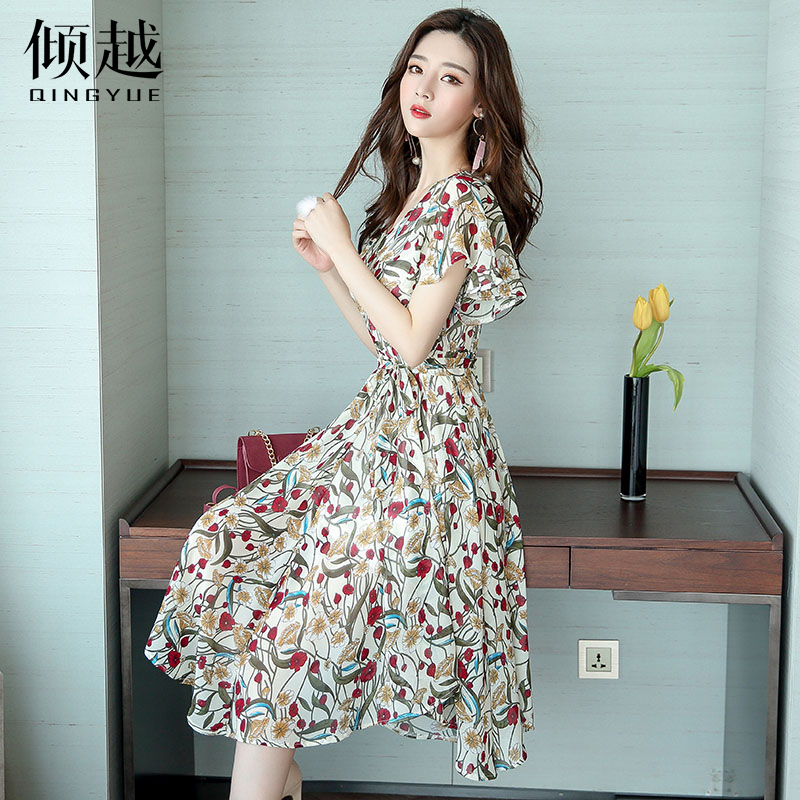 / 2017夏裝新款韓版雪紡碎花收腰顯瘦V領中長款不規則裙擺連衣裙女