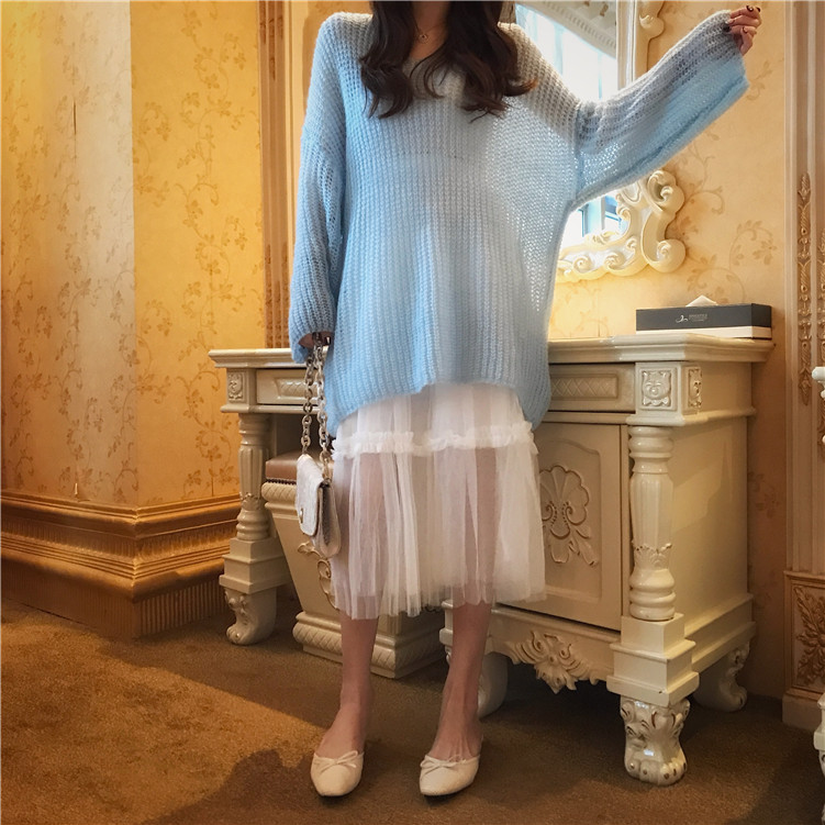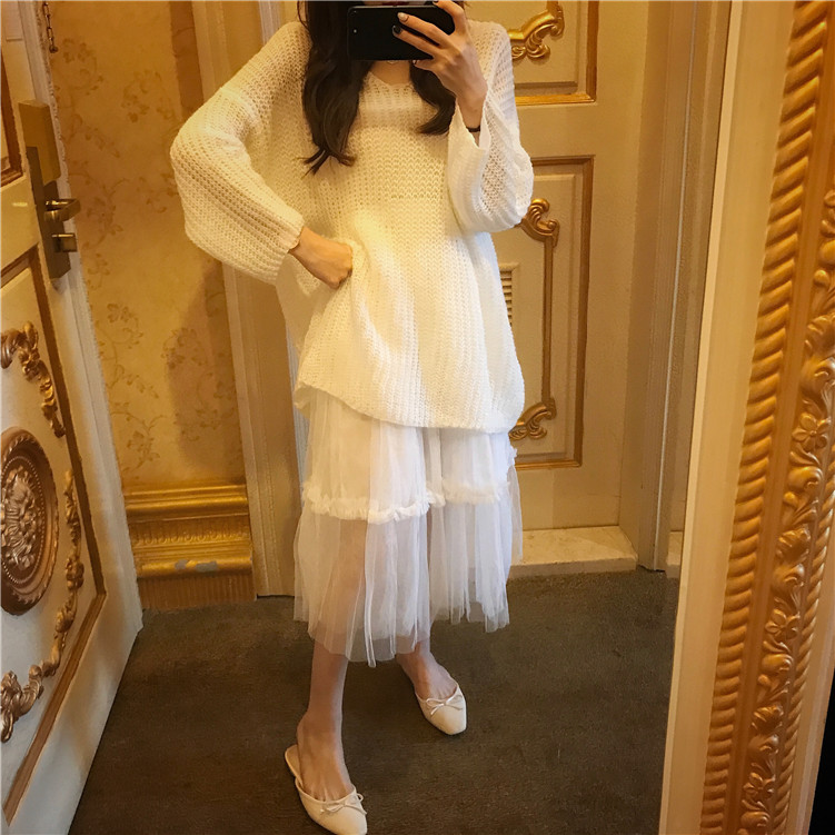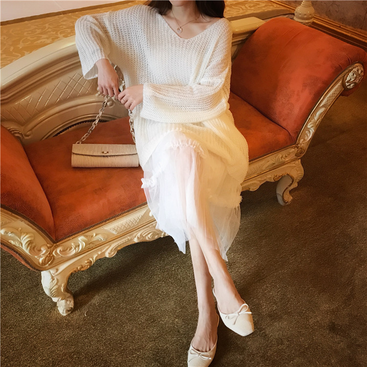 復古慵懶寬松v領毛衣仙女紗裙高腰顯瘦半身裙港風套裝時尚兩件套