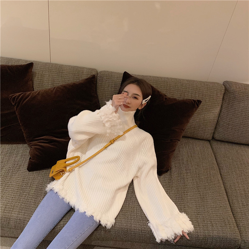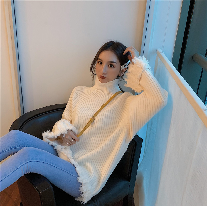 秋冬新款韓版時尚保暖甜美上衣慵懶寬松加厚高領拼接流蘇針織毛衣