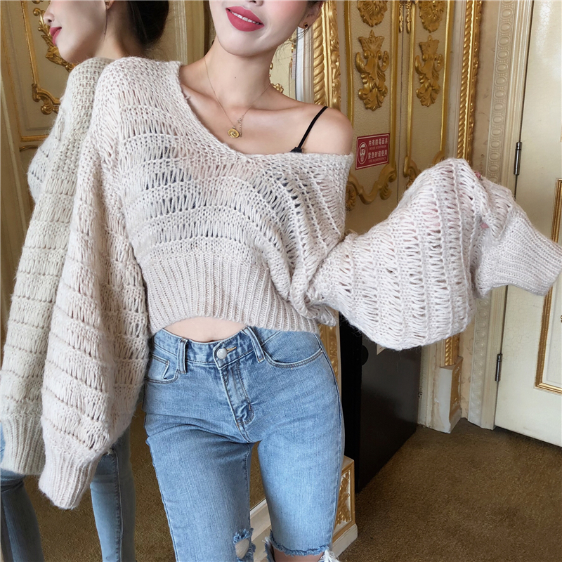 2018新款韓版秋裝上衣女短款百搭寬松V領燈籠袖針織衫慵懶毛衣潮