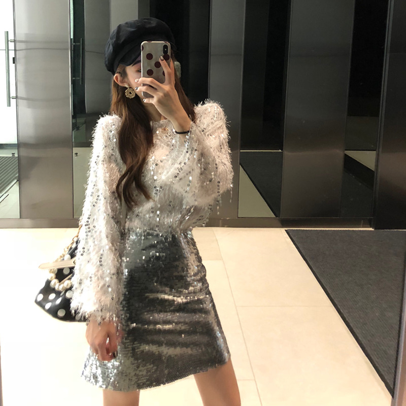 2018秋裝新款韓版兩件套女氣質重工流蘇亮片上衣珠片短裙時尚套裝