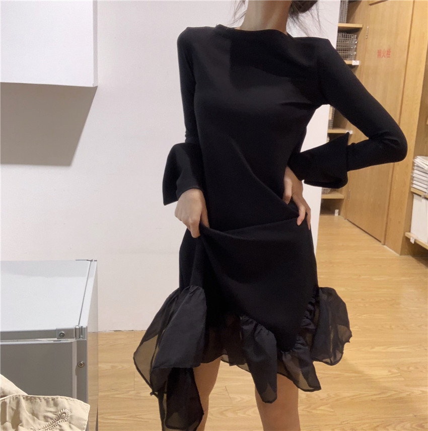 秋冬新款黑色開叉長袖外套寬松上衣+不規則黑色高腰中長款連衣裙