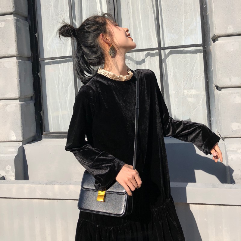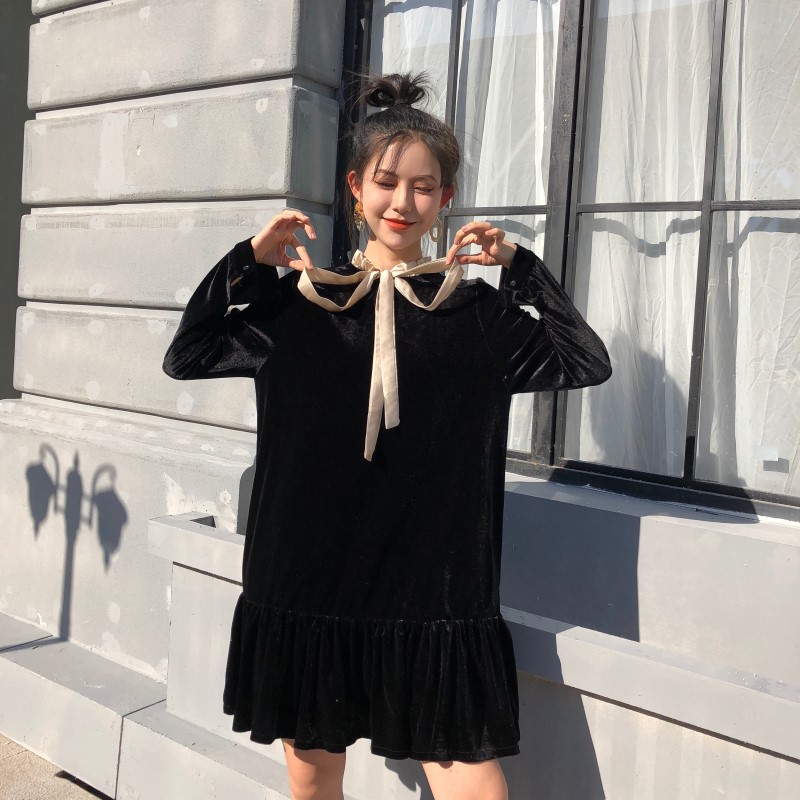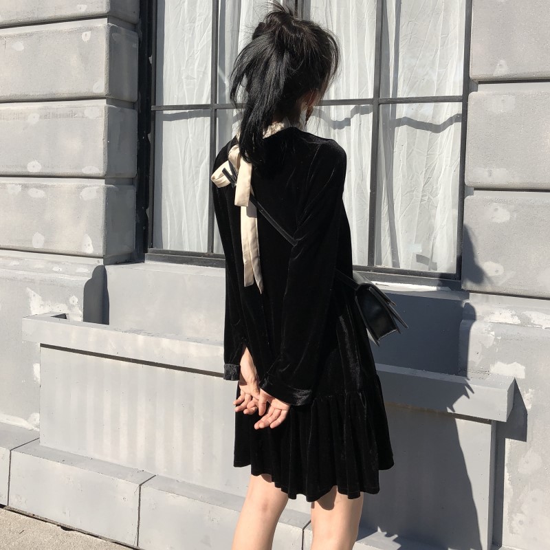 / 時尚港味秋裝女2018新款裙子百搭顯瘦前后兩穿中長款絲絨連衣裙女