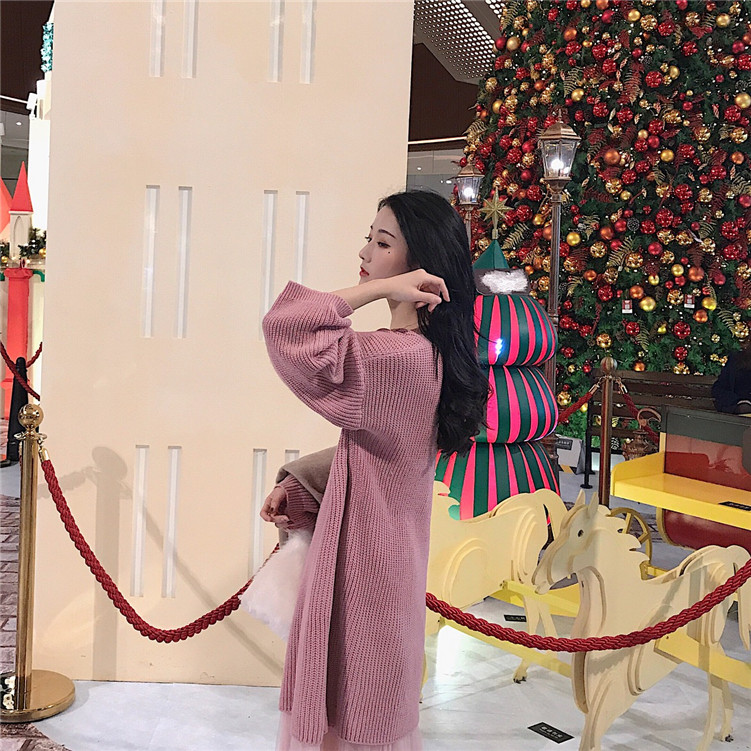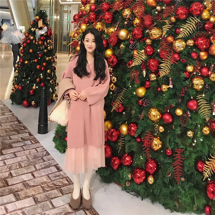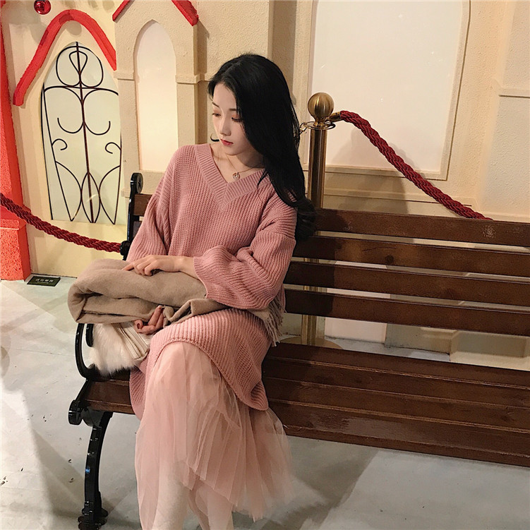 / 針織連衣裙秋冬韓版V領長袖寬松百搭毛衣中長款女裙時尚氣質套裝