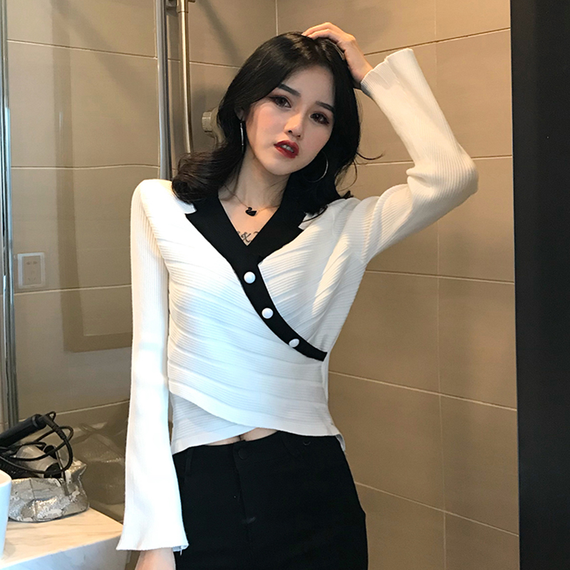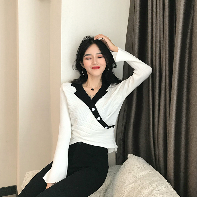 / chic新款韓版修身顯瘦上衣女裝百搭氣質時尚喇叭袖秋冬打底針織衫