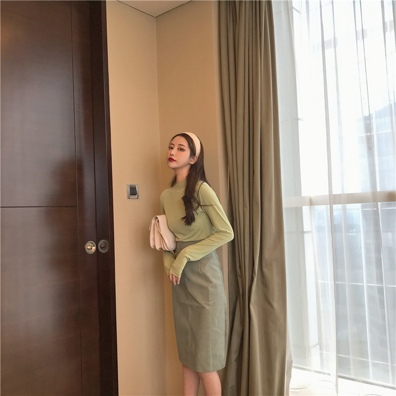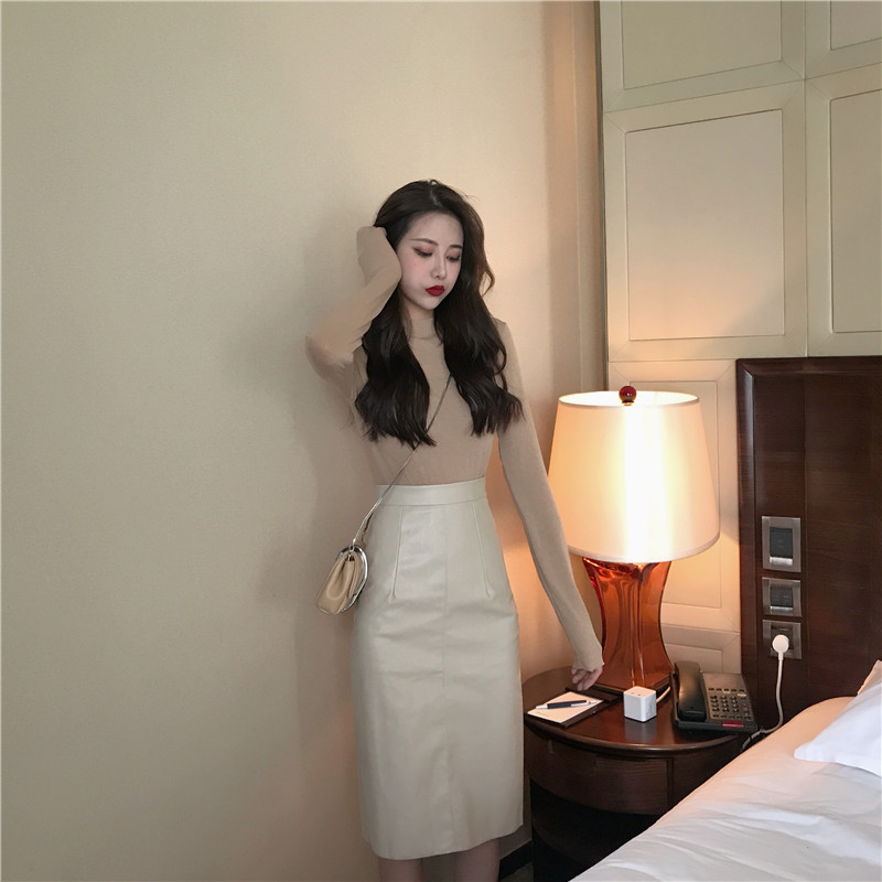 / 復古簡約基礎立領T恤高腰顯瘦中長款半身皮裙時尚套裝兩件套女潮