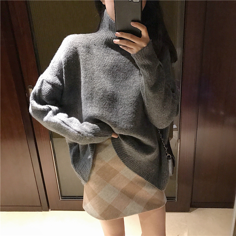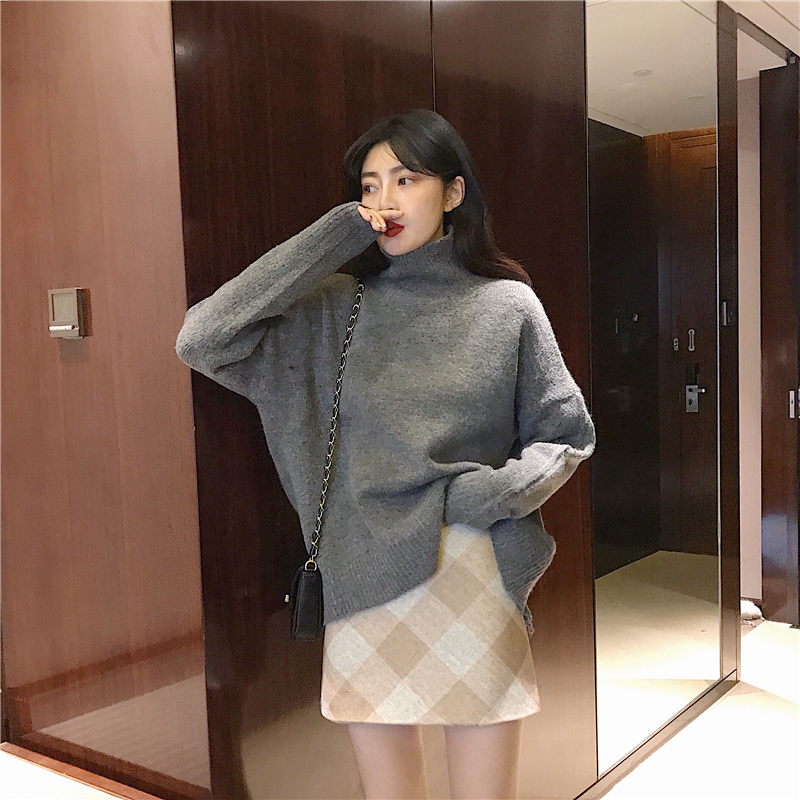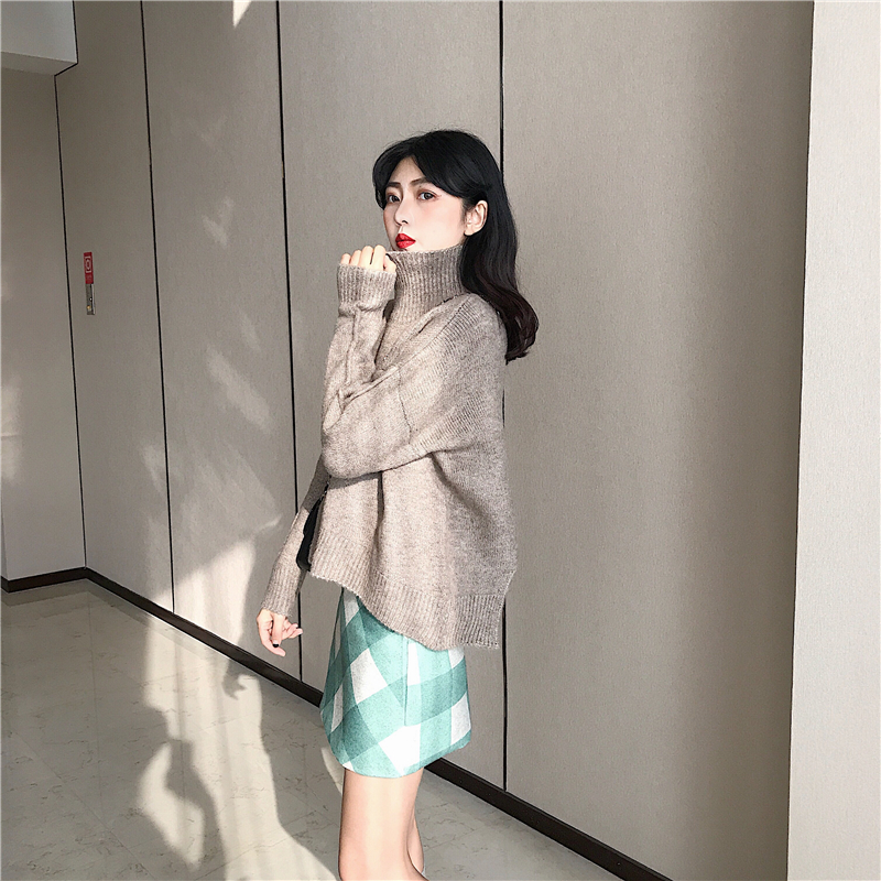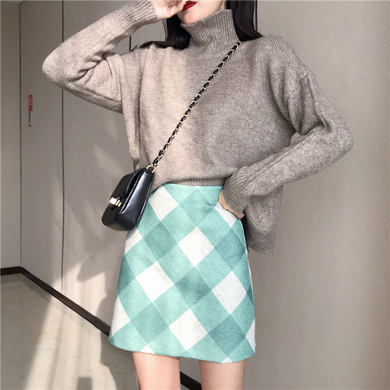 / 港味復古chic慵懶風高領毛衣女秋冬新款+高腰毛呢格子半身裙套裝