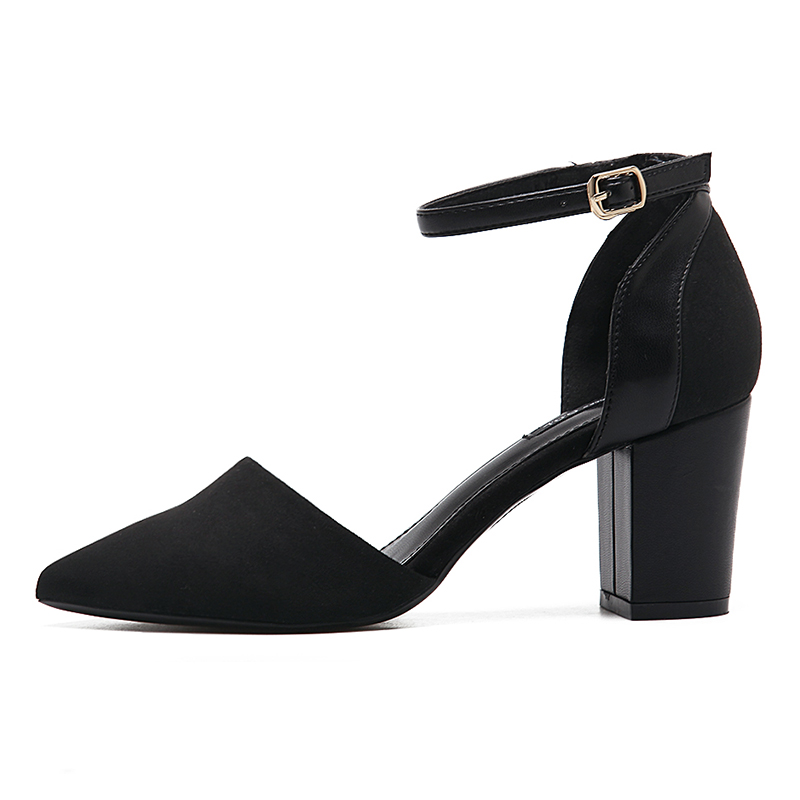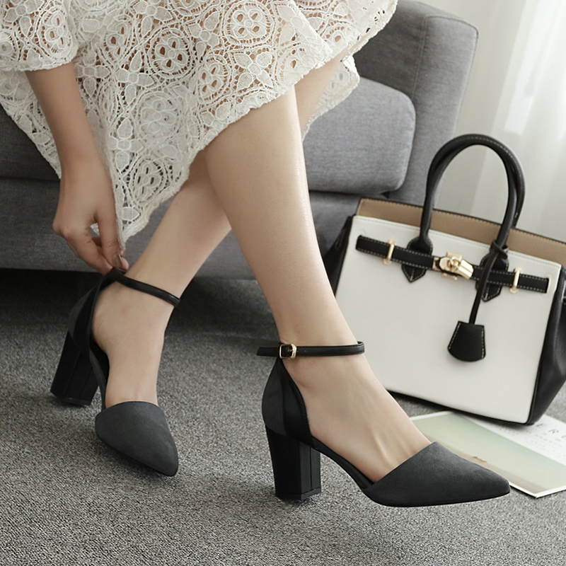 尖頭單鞋女中跟粗跟高跟鞋子春季新款百搭夏天一字扣淺口女鞋