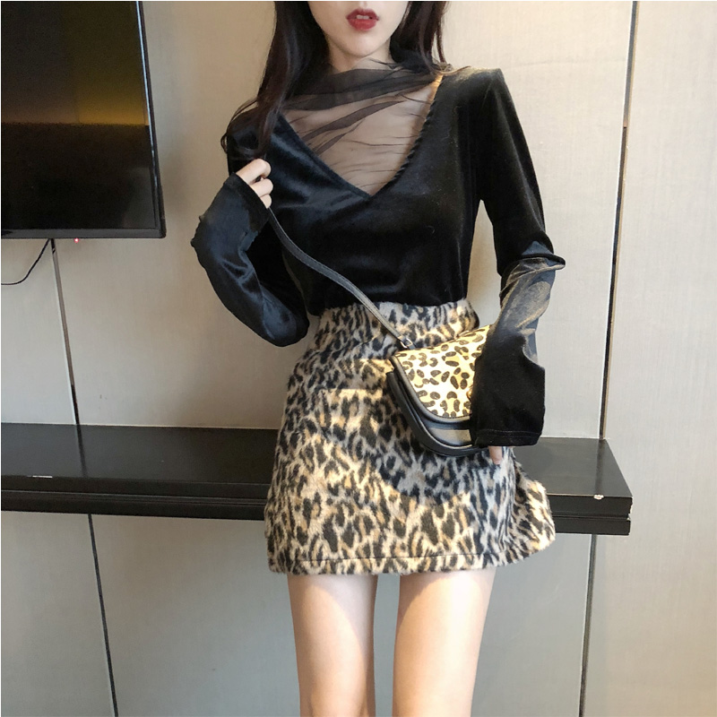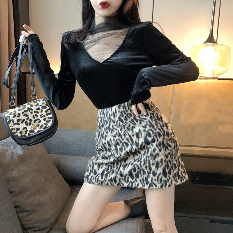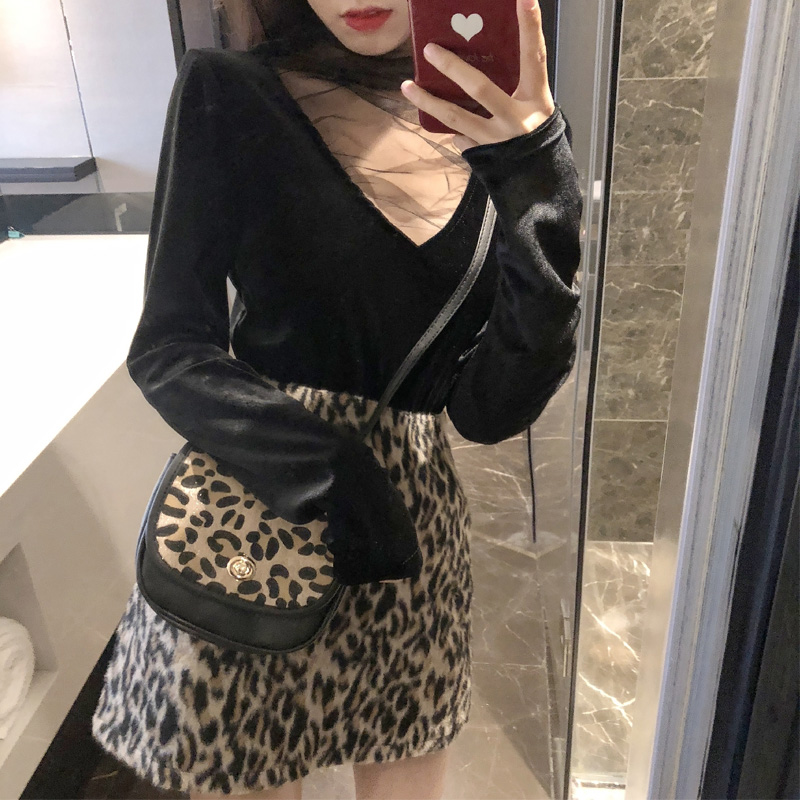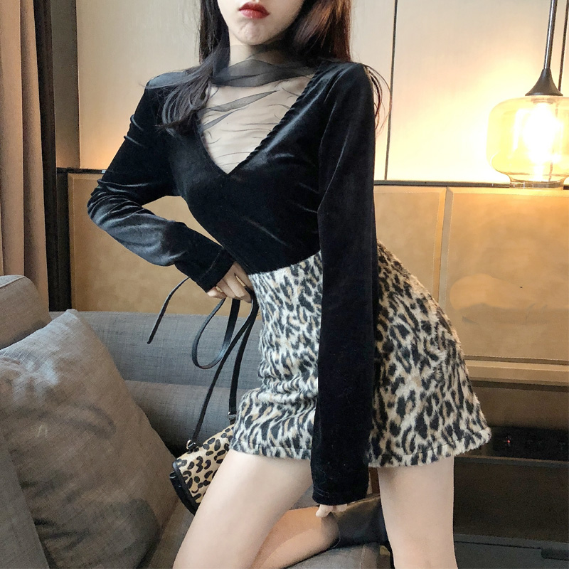 冬裝上衣女慵懶長袖t袖女氣質V領網紗拼接金絲絨百搭修身打底Tee