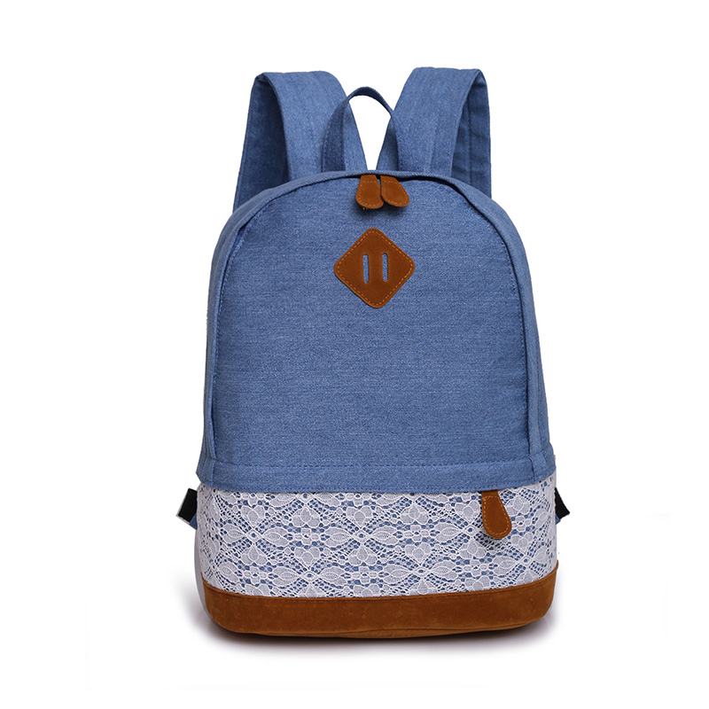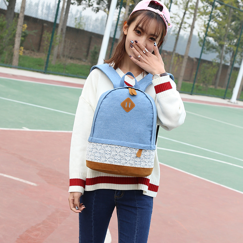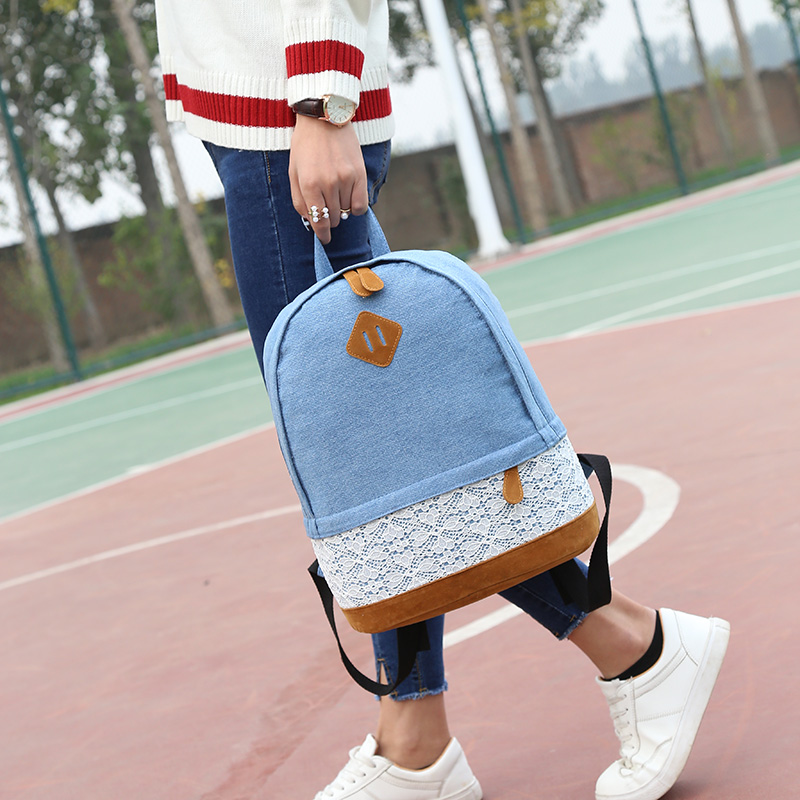 新款花邊蕾絲牛仔布雙肩包韓甜美學院風小清新背包中小學生書包方