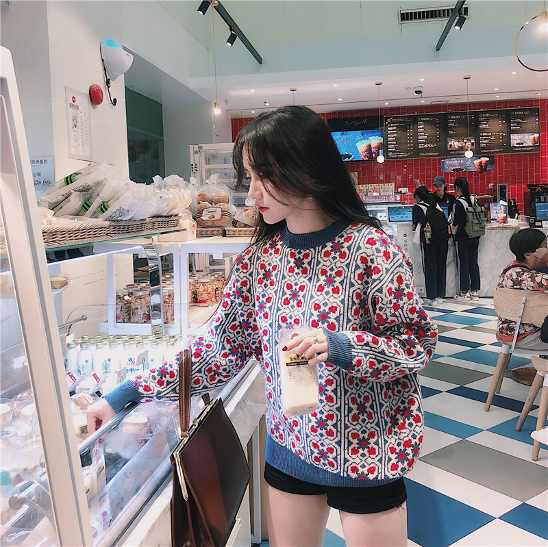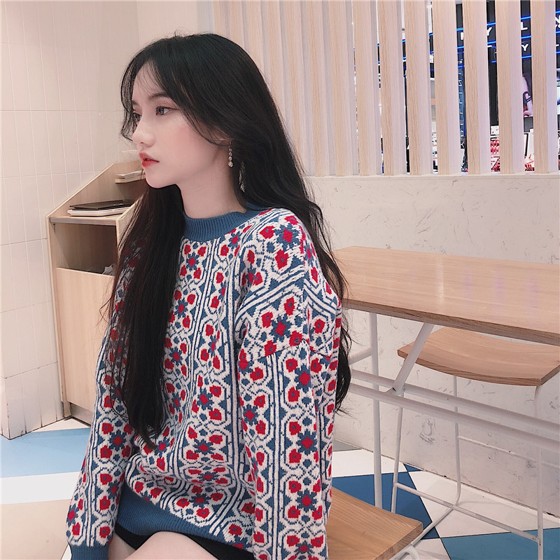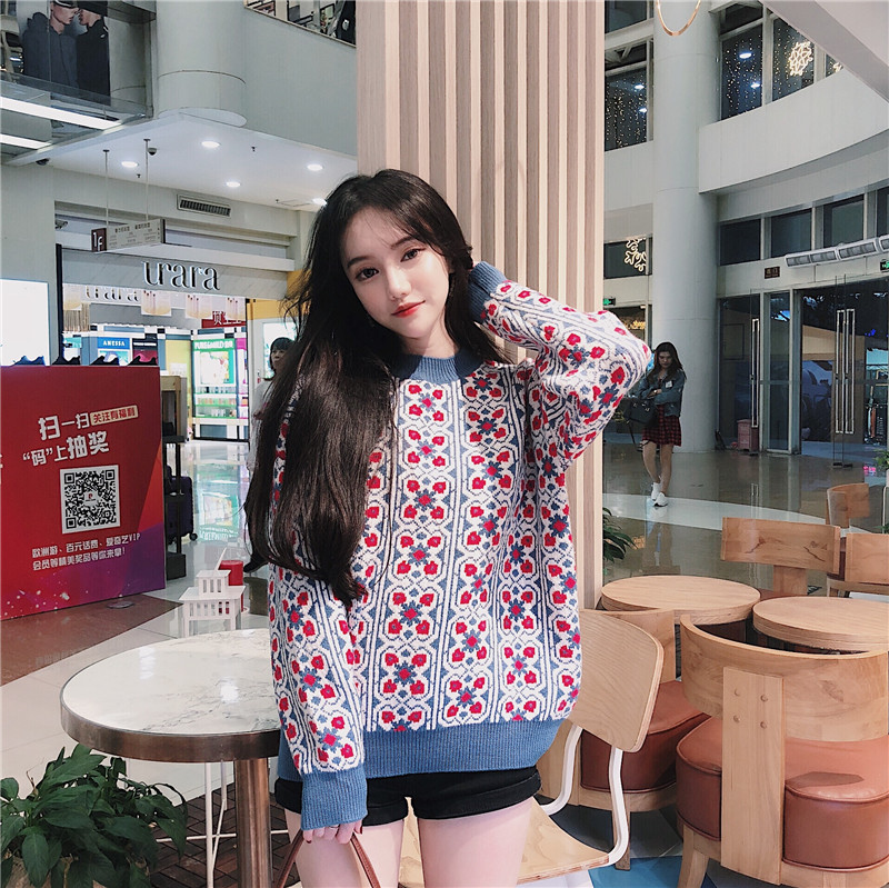 / 2018秋冬新款時尚chic溫柔風花花毛衣女套頭寬松懶惰圓領毛線衣女