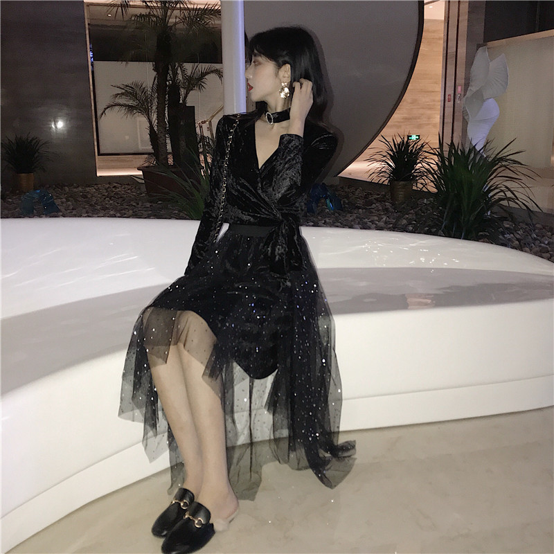 港味秋冬2018新款溫柔風套裝時尚氣質絲絨上衣+網紗半身裙兩件套