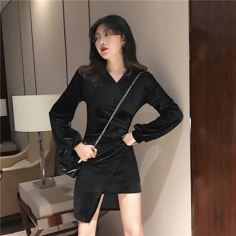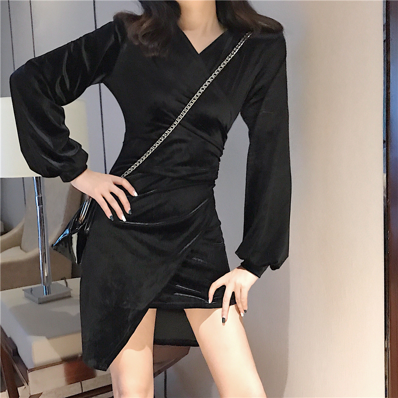 冬季絲絨打底裙新款韓版收腰短裙復古chic修身顯瘦不規則連衣裙女