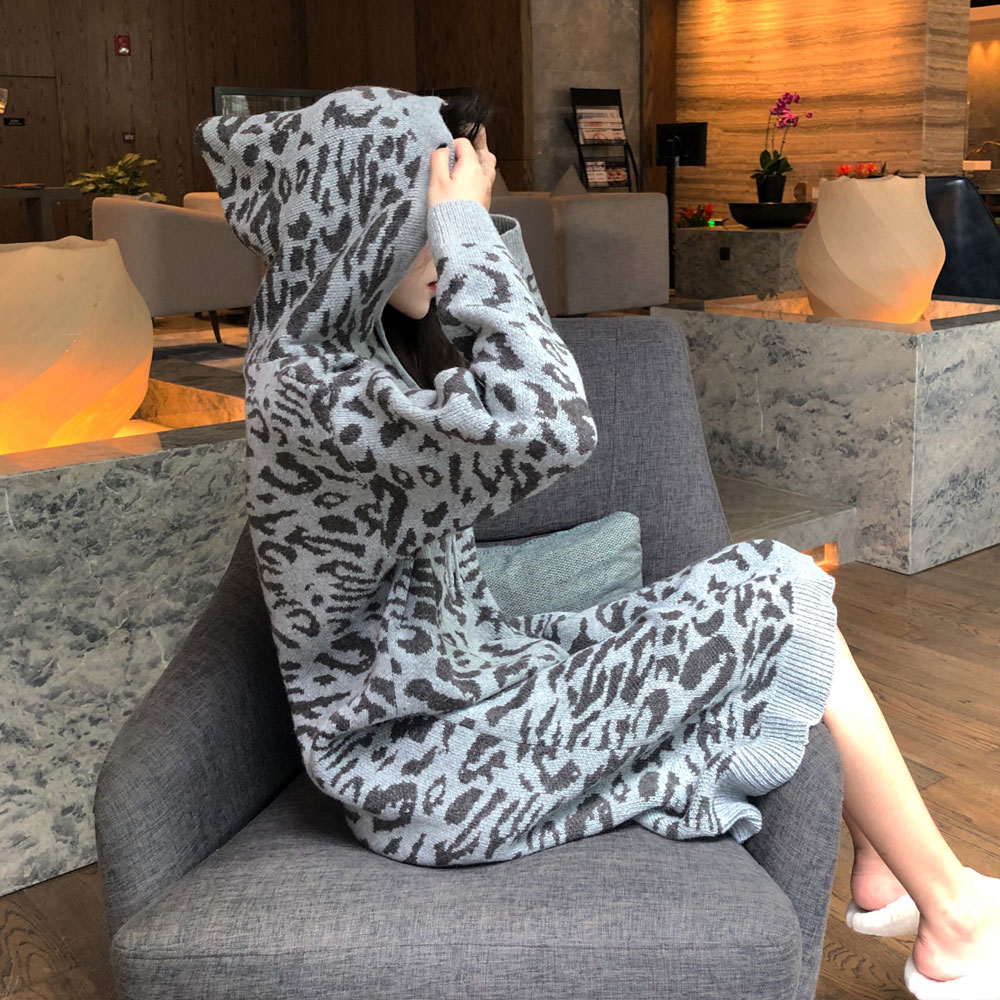 / 港味時尚復古寬松豹紋連帽針織連衣裙女秋冬2018新款中長款毛衣裙