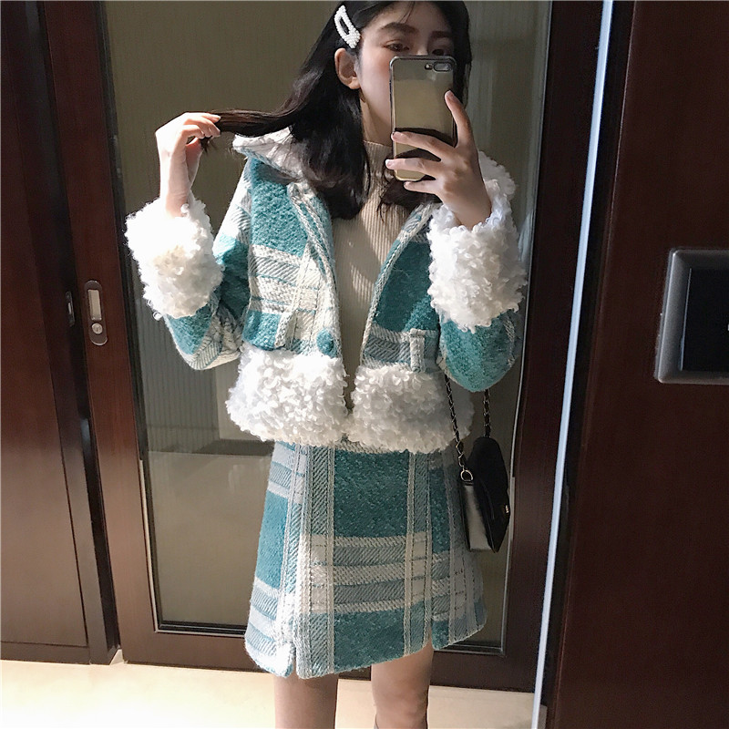 / 秋冬季時尚氣質羊毛呢子短款格子毛領毛呢外套女+毛呢半身裙套裝