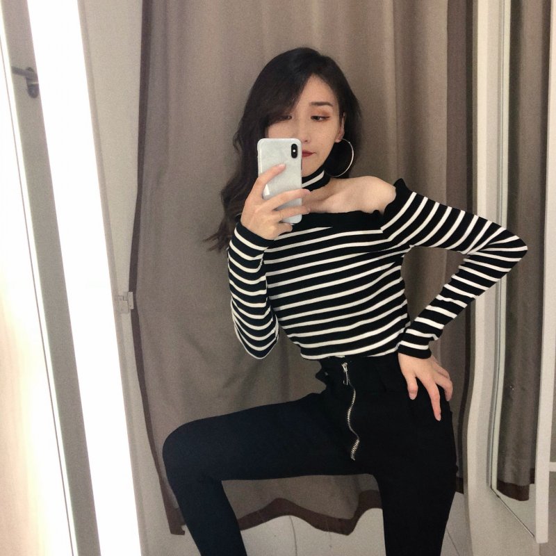/ 新款露肩掛脖條紋長袖針織衫開叉毛線半身裙港風時尚套裝兩件套女