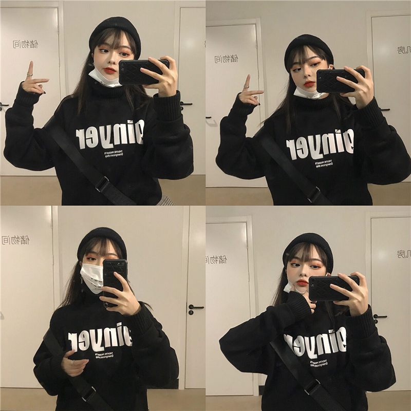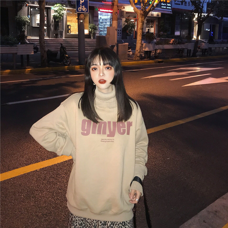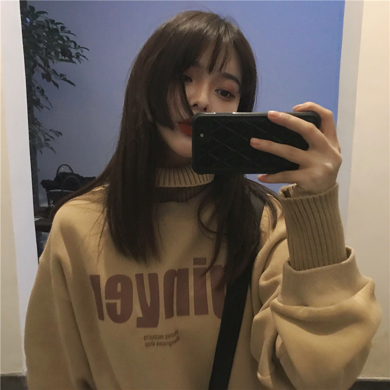 冬季女裝復古港風加厚毛線高領拼接假兩件字母套頭衛衣女2018新款