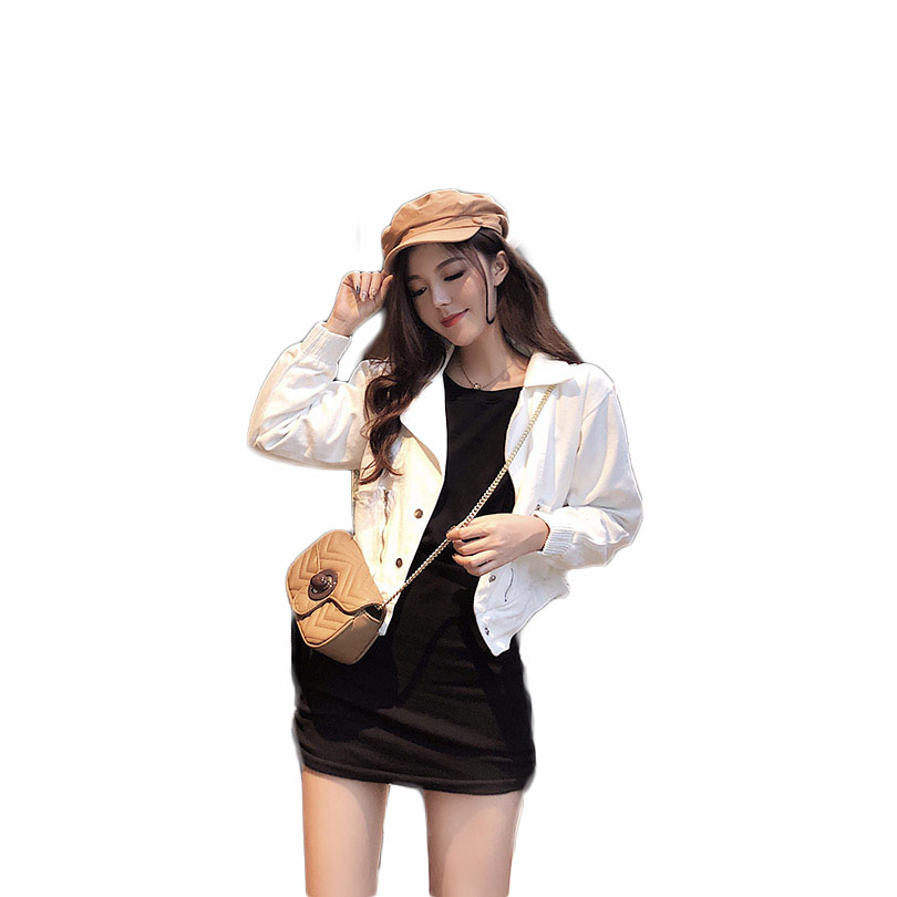 / 港味新款短款寬松顯瘦夾克衫白色牛仔外套女+露肩包臀抽繩連衣裙