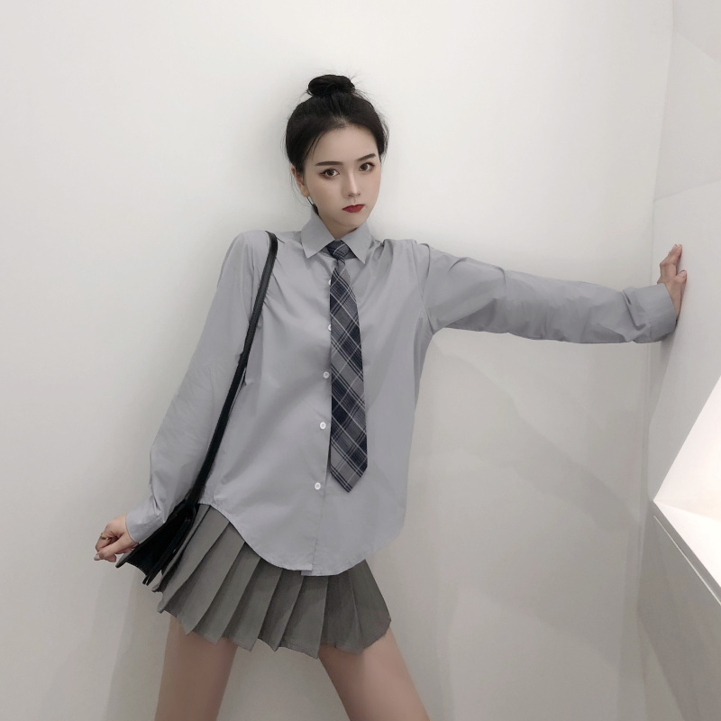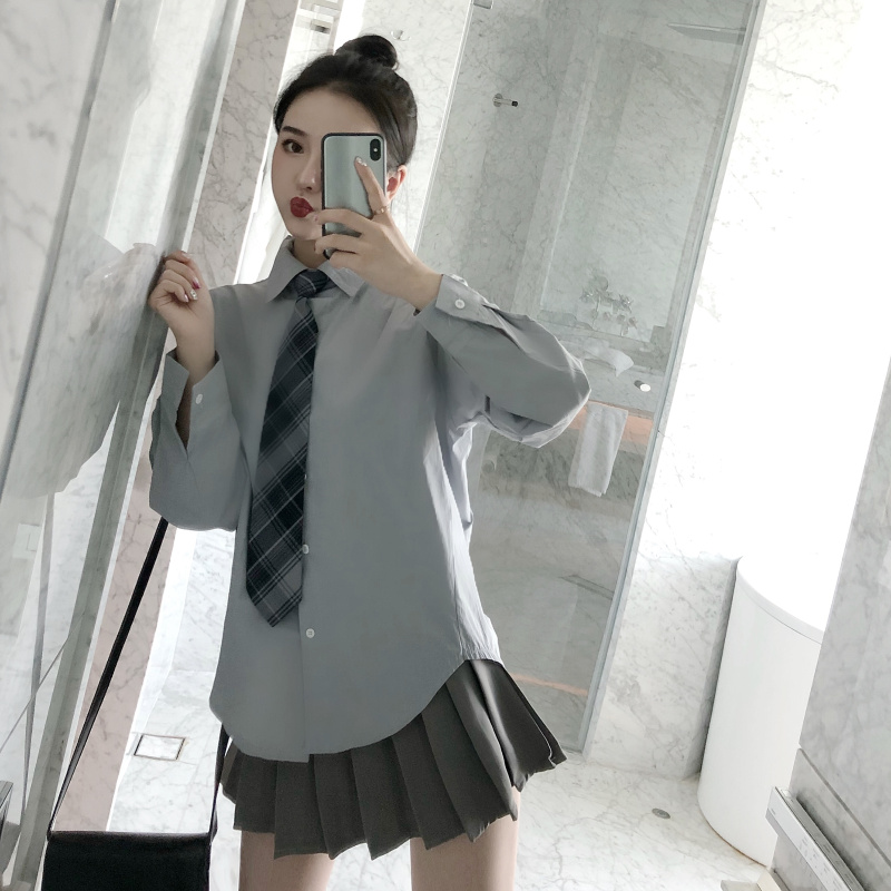 / 韓國秋裝學院風寬松長袖襯衫格紋領帶百褶高腰半身裙時尚套裝女潮