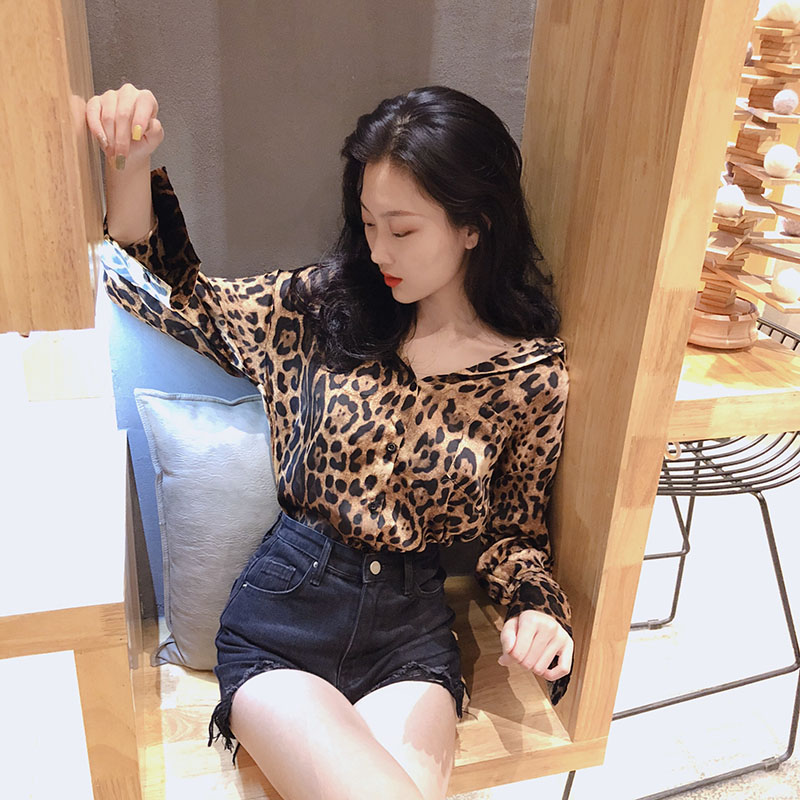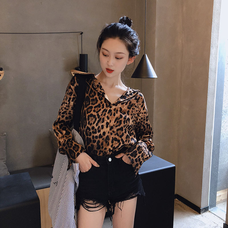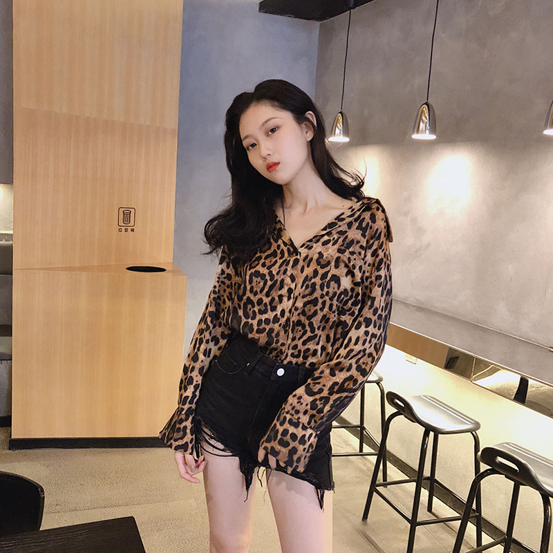 / 2018秋裝新款chic時尚亮眼豹紋長袖襯衫V領百搭氣質上衣潮流女裝