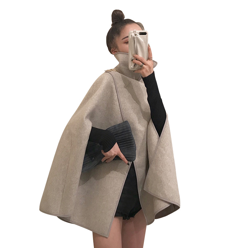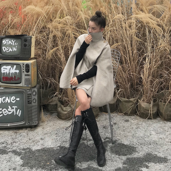 新款時尚套裝寬松斗篷短款呢子外套百搭純色針織打底衫chic兩件套