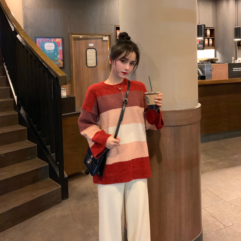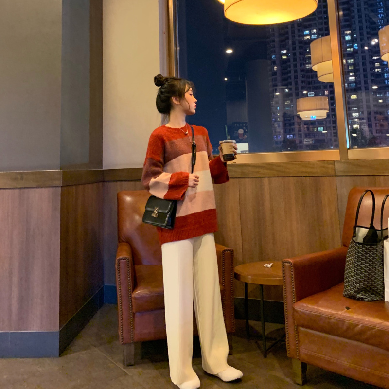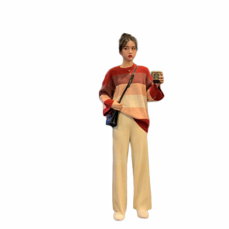 慵懶溫柔拼色針織衫+簡約純色高腰松緊腰綁帶長褲針織褲女兩件套