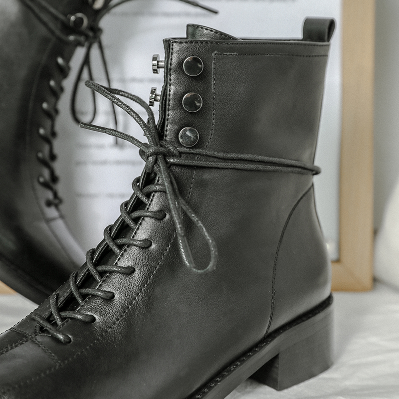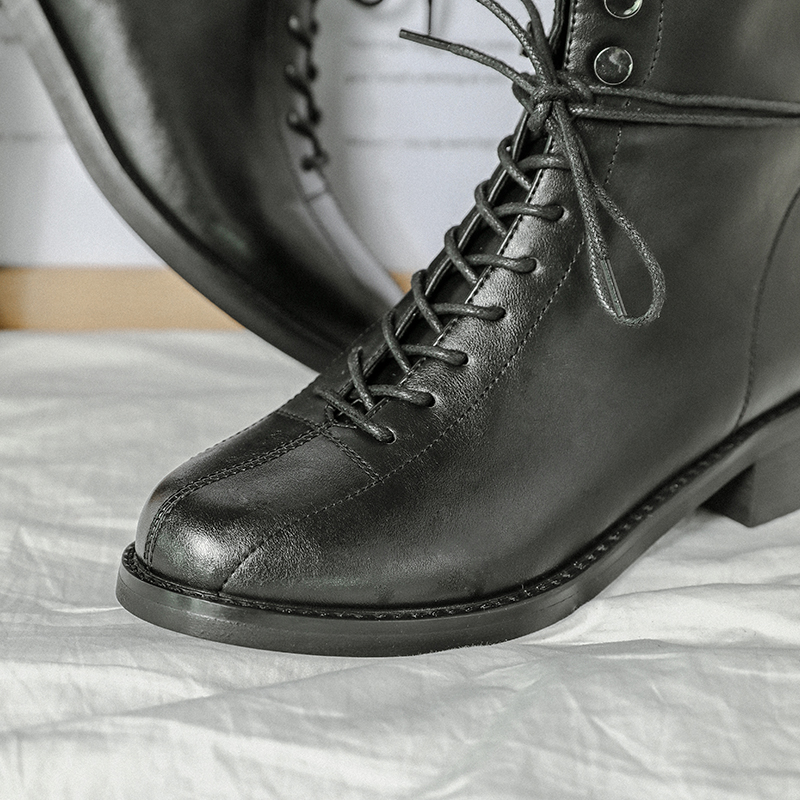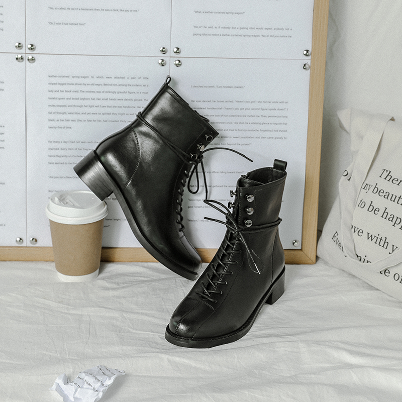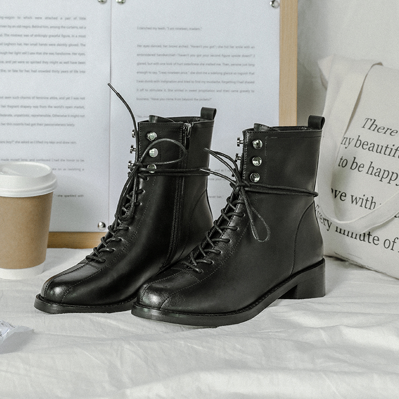 MG小象圓頭復古馬丁靴女2018新款冬季黑色皮鞋中跟系帶側拉鏈短靴