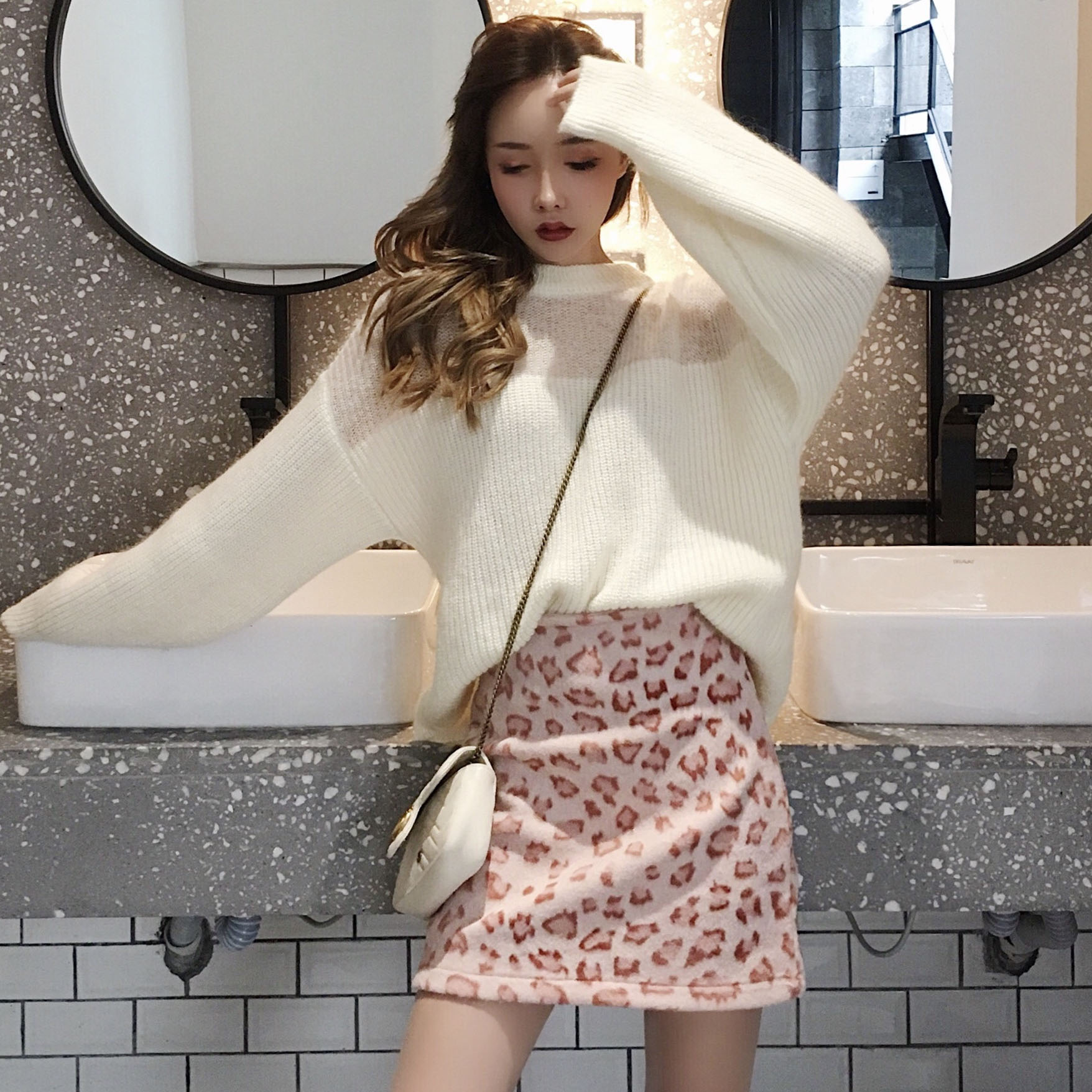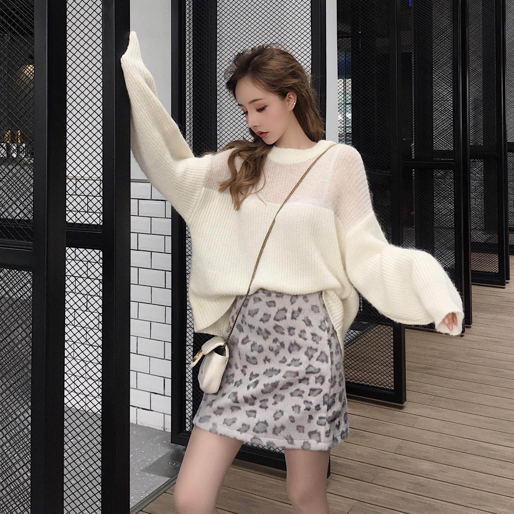 秋裝女2018新款套裝chic豹紋長袖毛衣+韓版百搭高腰A字半身裙皮裙
