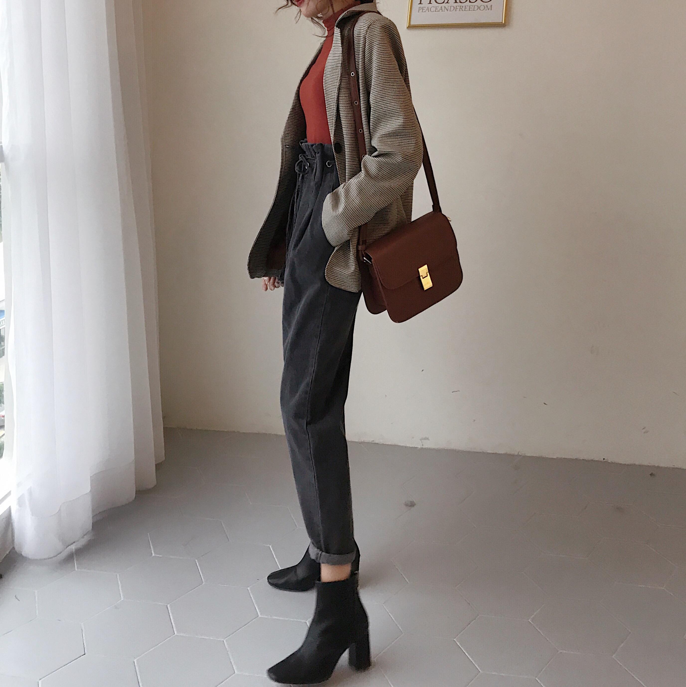 / 牛仔褲女秋冬新款chic港味復古寬松顯瘦高腰系繩牛百搭哈倫褲長褲