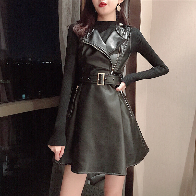 / 港味秋季新款韓版時尚洋氣套裝長袖修身針織衫百搭皮裙兩件套女裝