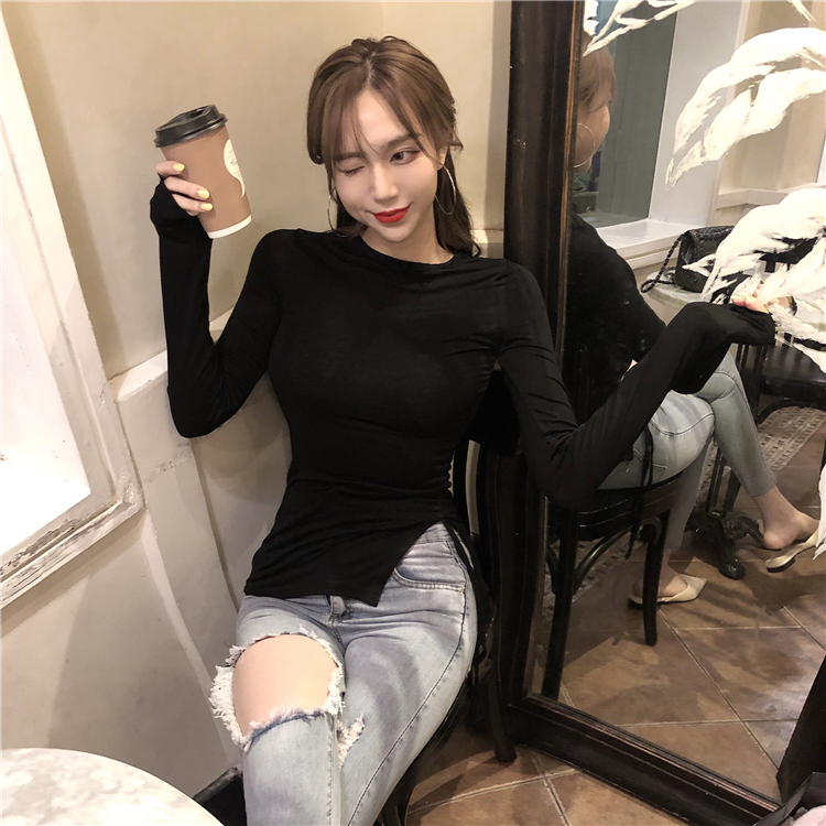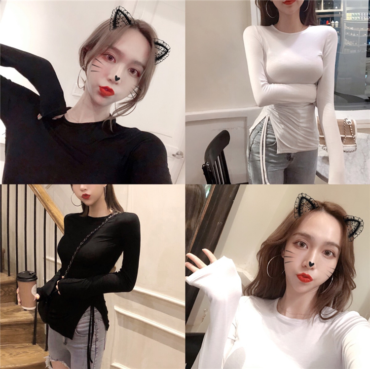 / 上衣女2018新款韓版修身顯瘦T恤純色圓領長袖復古chic抽繩打底衫