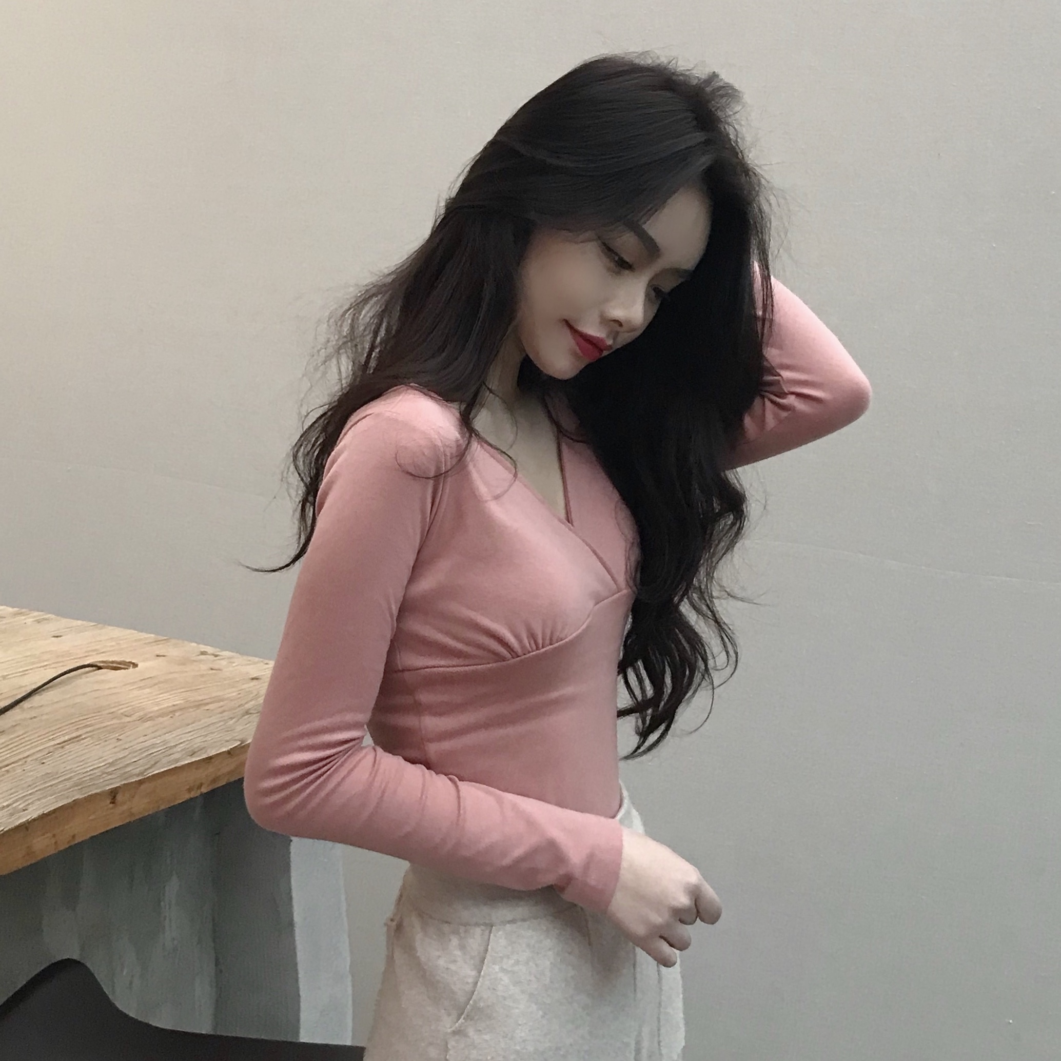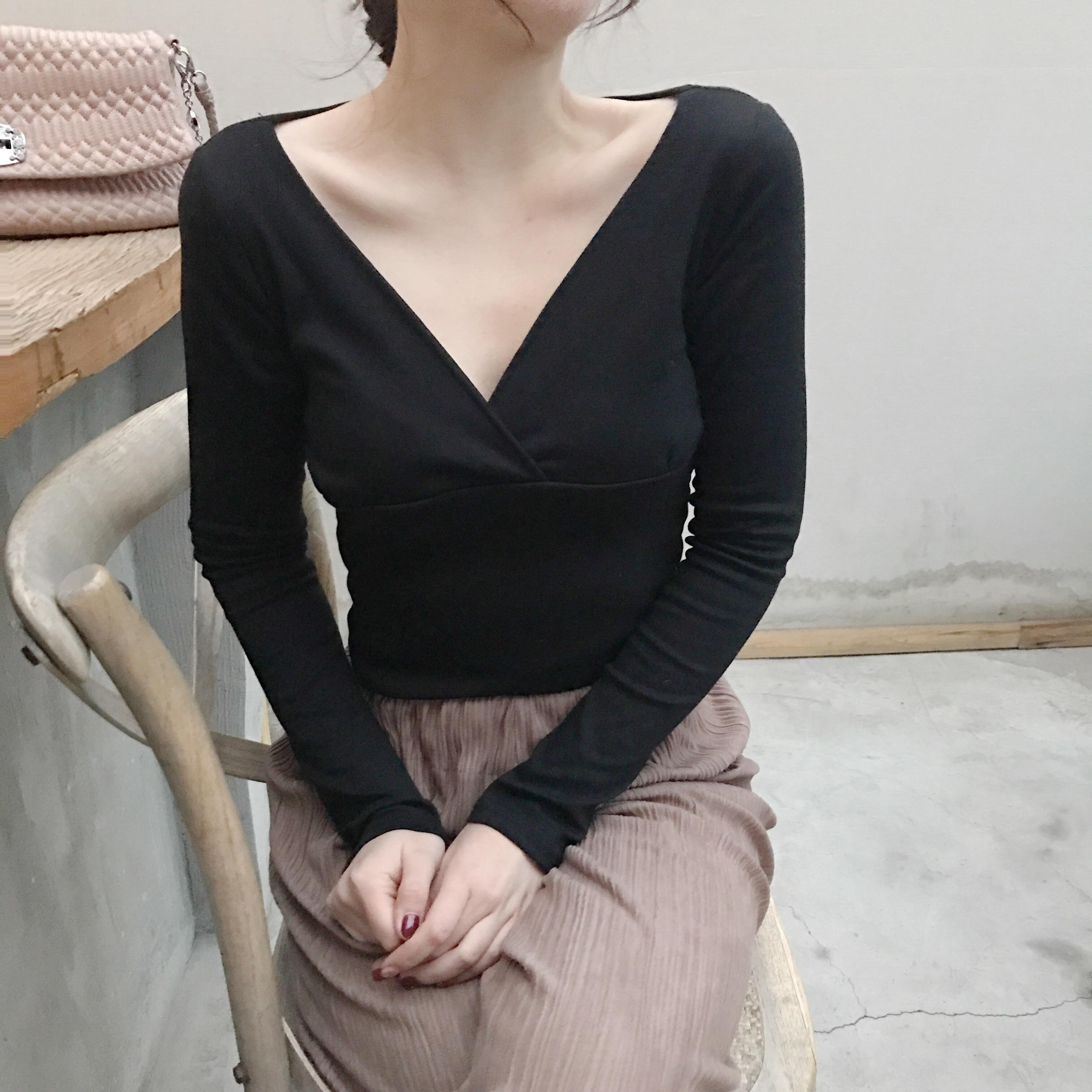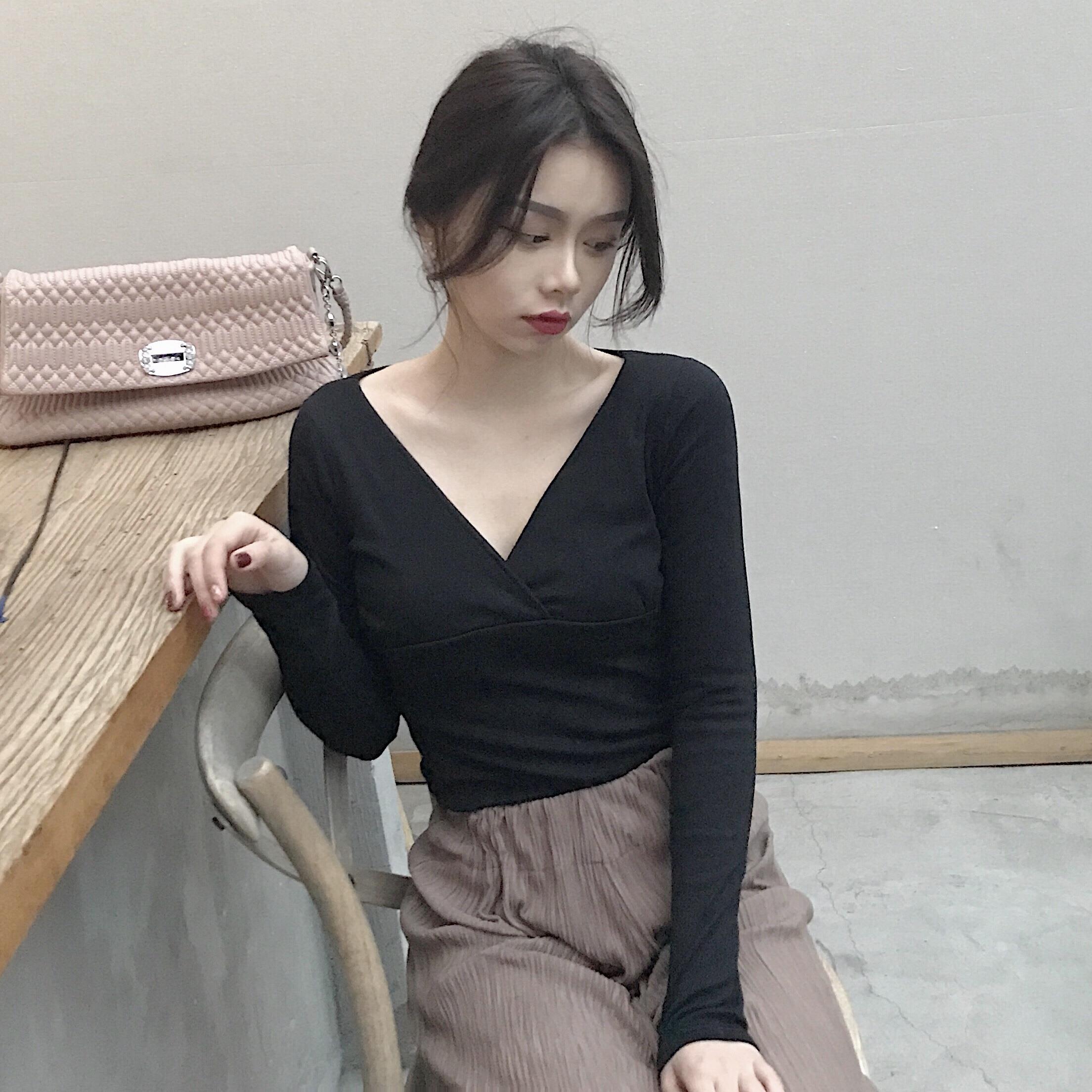 復古港味高腰V領顯瘦上衣chic百搭交叉領加薄絨秋冬長袖打底衫女