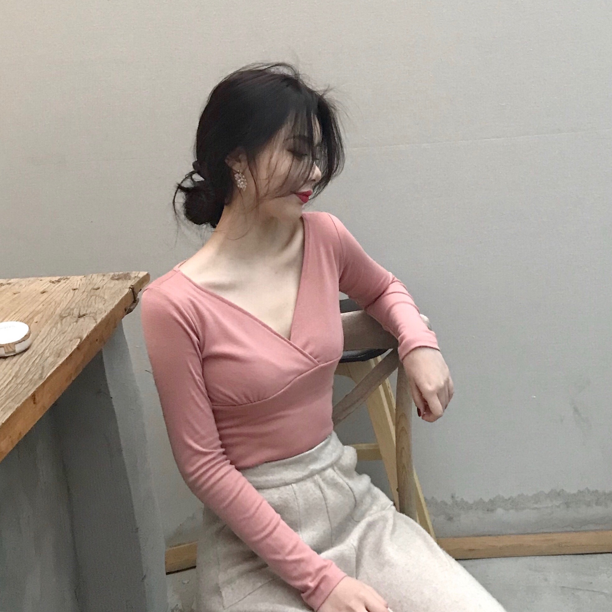 / 復古港味高腰V領顯瘦上衣chic百搭交叉領加薄絨秋冬長袖打底衫女