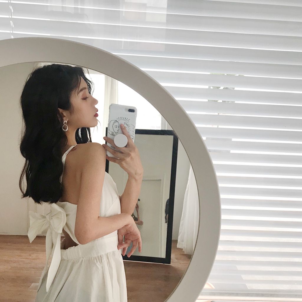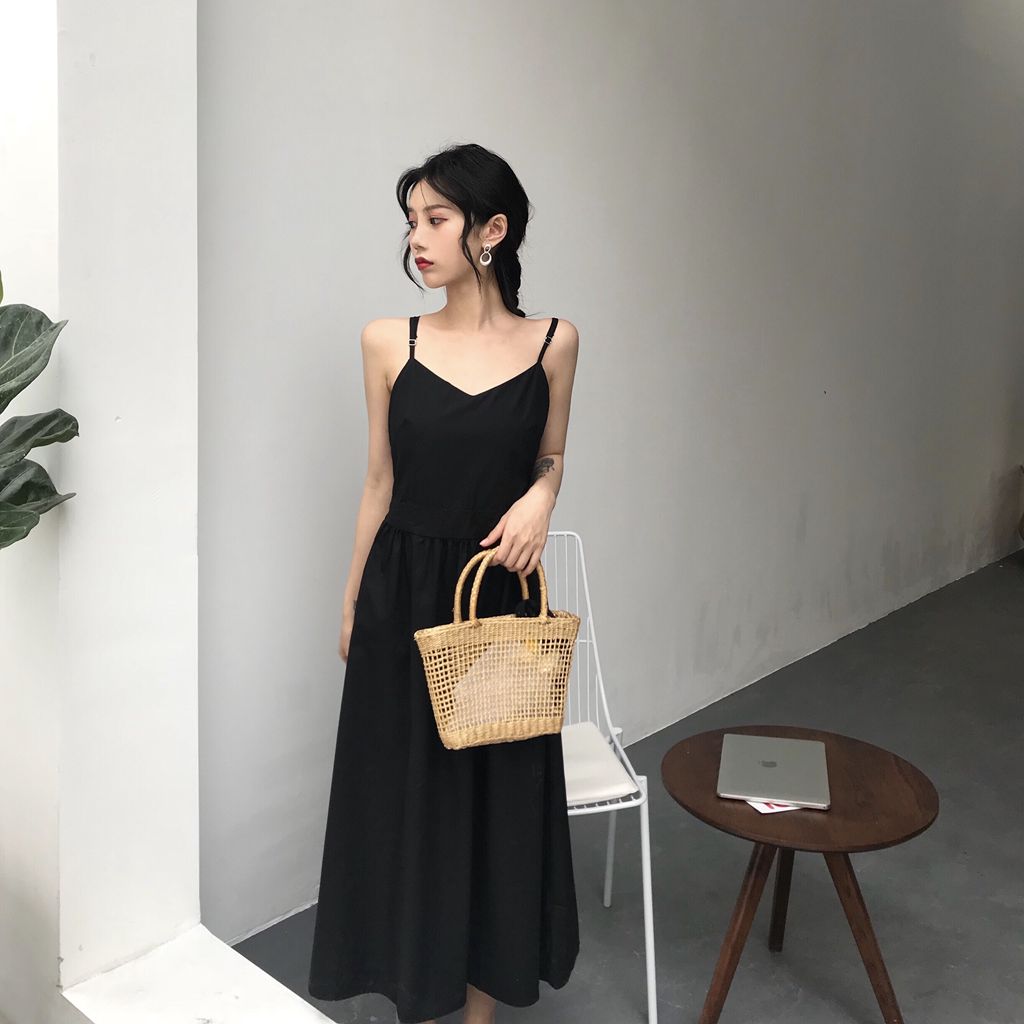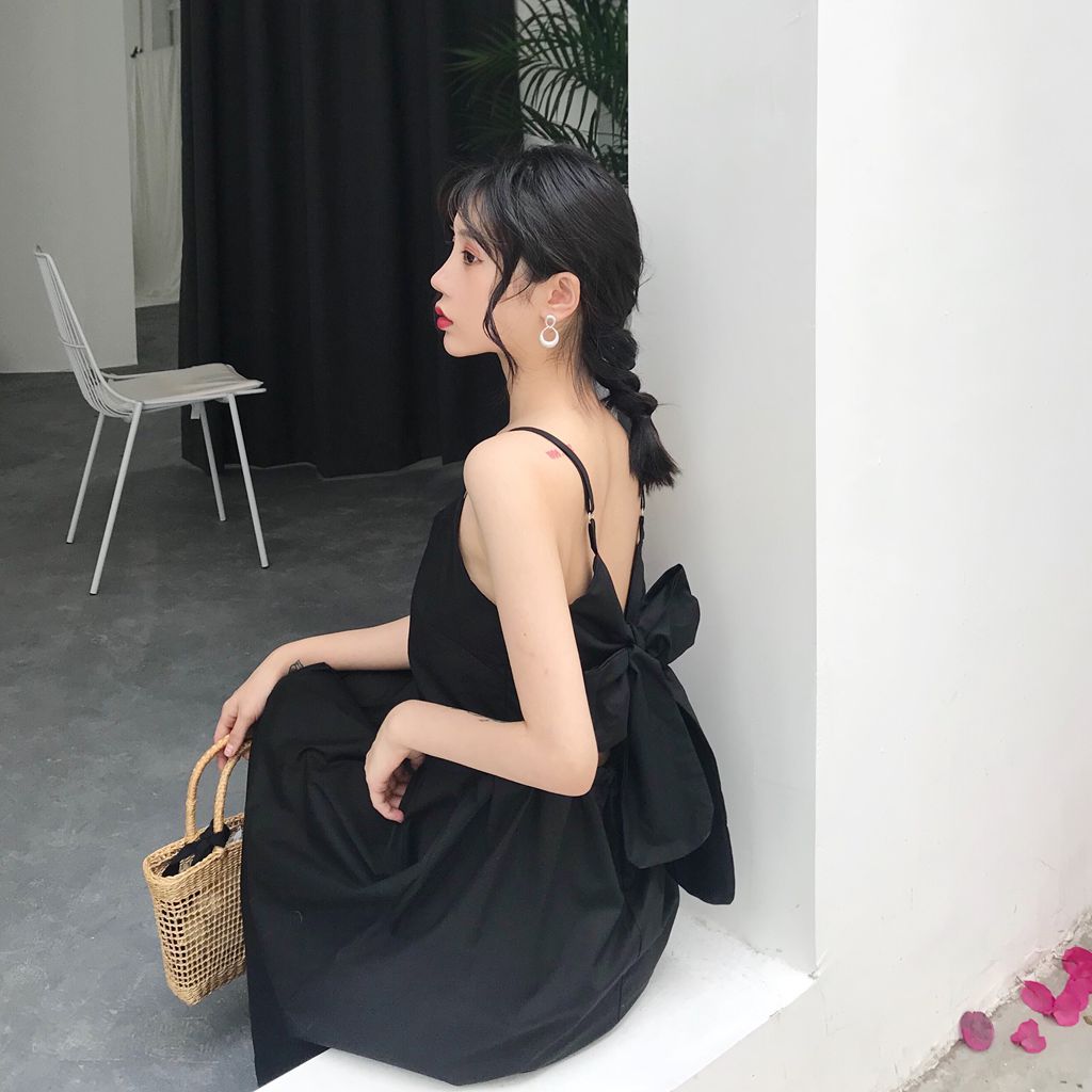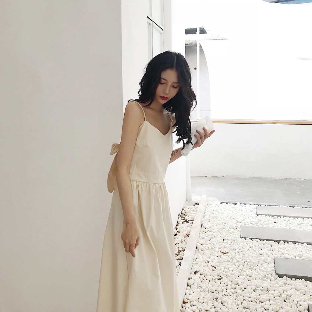 / 新款露背設計寬松綁帶港味復古chic風小清新中長款仙女吊帶連衣裙