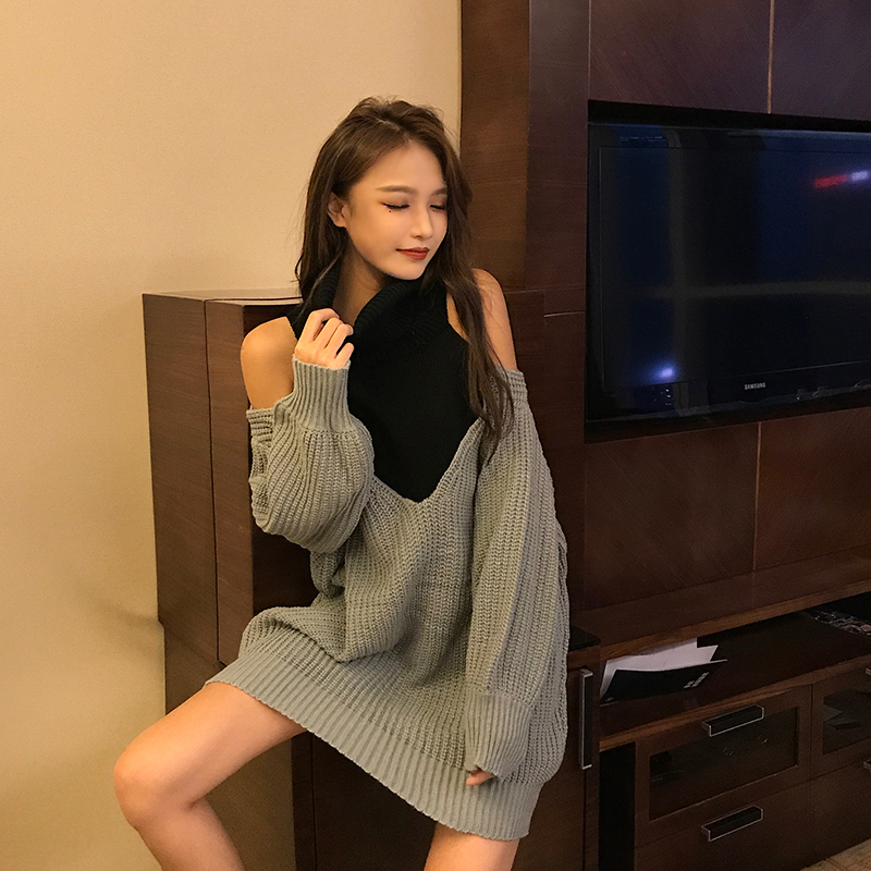 復古chic新款假兩件小心機露肩設計感上衣長袖寬松中長款百搭毛衣