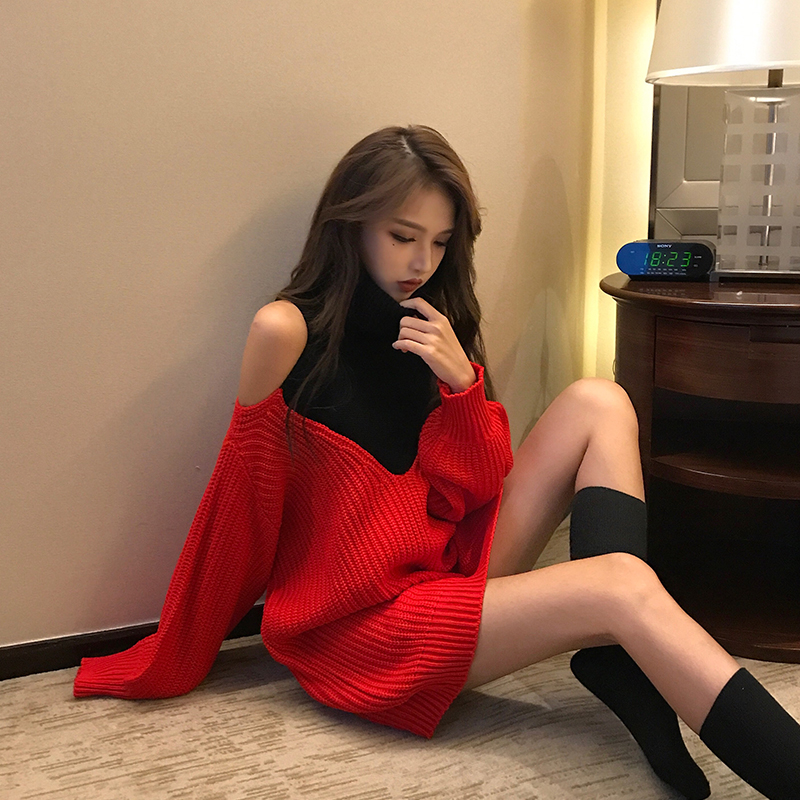 / 復古chic新款假兩件小心機露肩設計感上衣長袖寬松中長款百搭毛衣