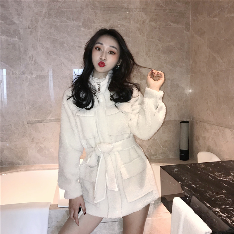 / 韓版chic新款復古時尚小香風高領中長款系帶收腰顯瘦毛絨絨外套女