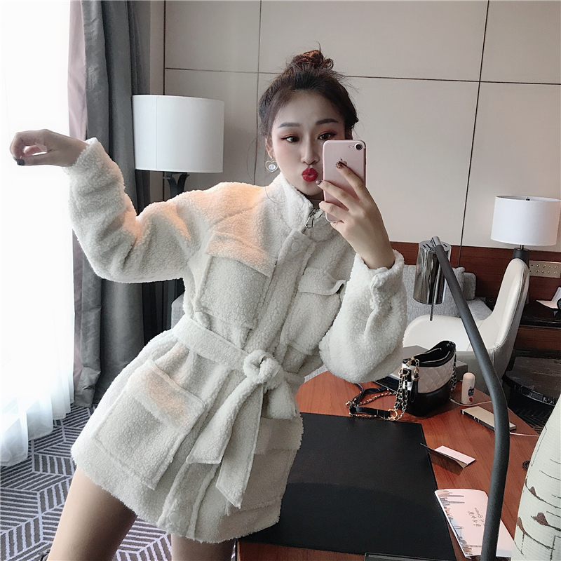 韓版chic新款復古時尚小香風高領中長款系帶收腰顯瘦毛絨絨外套女