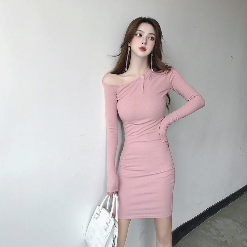 2018新款斜肩露肩一字領性感系扣螺紋長袖中長款顯瘦顯身材連衣裙