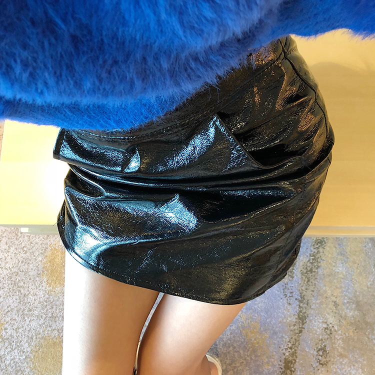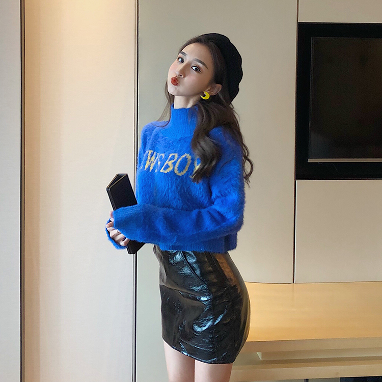 復古毛茸茸高領寬松純色字母毛衣高腰漆皮半身短裙時尚套裝兩件套