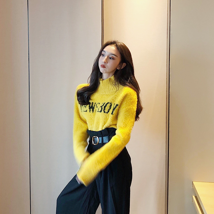 / 復古毛茸茸高領寬松純色字母毛衣高腰漆皮半身短裙時尚套裝兩件套
