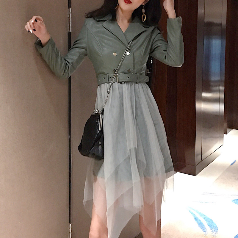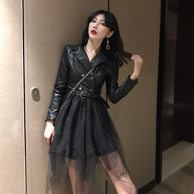 2018新款時尚港味氣質女人味外套皮衣拼接網紗假兩件連衣裙秋裝女